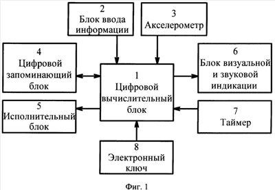 В качестве цифрового вычислительного блока 1 может быть выбран одноплатный микроконтроллер типа АТ89С2051 с тактовой частотой 4 МГц. Блок ввода информации 2 – это набор кнопок управления для ввода информации и задания режима работы цифрового вычислительного блока 1. Акселерометр 3 может быть выполнен на микросхеме типа ADXL, а цифровой запоминающий блок 4 может быть представлен в виде FLASH памяти. Исполнительный блок 5 выполнен в виде силового трехфазного реле с управлением через составной транзистор от цифрового вычислительного блока 1. Блок визуальной и звуковой индикации 6 представляет собой выходной регистр с индикацией десятичного кода на семисегментном индикаторе, звуковая индикация осуществляется за счет пьезоизлучателя. Таймер 7 может быть выполнен в виде генератора импульсной последовательности. Электронный ключ 8 представляет собой постоянное запоминающее устройство, в котором содержится код разрешения доступа к перепрограммированию цифрового вычислительного блока 1, выполнен съемным и устанавливается во внешний разъем цифрового вычислительного блока 1.