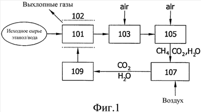 приведение в контакт исходной сырьевой смеси газов, содержащей этанол, с катализатором дегидрирования при температуре ниже примерно 400°С в реакционной зоне дегидрирования, с получением смеси продуктов, содержащей водород, где упомянутый катализатор дегидрирования включает в себя медь на поверхности металлического носителя; введение водорода из смеси продуктов и кислорода в топливный элемент с получением электроэнергии и отходящего из топливного элемента потока газов, содержащего метан; введение отходящего из топливного элемента потока газов и кислорода в камеру сгорания; сгорание отходящего из топливного элемента потока газов в камере сгорания.