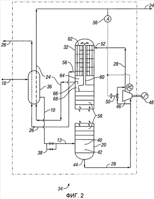На фиг.2 представлен вариант очистки сингаза 34 согласно настоящему изобретению, использующий механическое расширение потока жидких остатков 28 с генерированием основной части самоохлаждения в способе очистки 34. Вместо теплообменников с поперечным потоком 16, 18 на фиг.1 используют единственный теплообменник 36 с поперечным потоком, хотя теплообменник 36 с поперечным потоком может включать множество физических стадий. Поток исходного сингаза 10 пропускают через вентильную станцию 38 выше по потоку дистилляционной колонны 20. Вентильная станция 38 может включать линейный вентиль для потока в процессе нормальной работы и вторичный J-T-вентиль для регулирования и/или запуска для автоохлаждения. Поток исходного сингаза 10 затем поступает в зону впуска 40 колонны 20, предпочтительно, как смесь пара и жидкости сингаза. В зоне впуска 40 жидкость сингаза отделяется и собирается в зоне удерживания жидкости 42. Жидкость выходит из колонны 20 как поток остатков 28 через нижний выпуск 44. Поток 28 остатков колонны 20 расширяется с помощью расширителя жидкости 46 с автоохлаждением остатков 28 и извлечением работы 48, которая может быть использована для приведения в действие насоса, компрессора, электрогенератора или подобного. Как использовано здесь, “расширитель жидкости” является устройством, выдающим работу, которое принимает подачу жидкости и производит выходящий жидкий или парообразный продукт, предпочтительно, смешанный парожидкий выходящий продукт. Когда выходящим продуктом является жидкость, расширителем жидкости 46 может быть гидравлическая турбина.