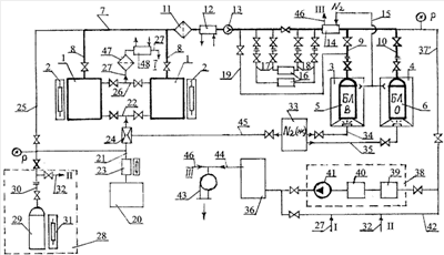 Приводят в рабочее состояние системы 20 и 28. Подготавливают индивидуально каждый баллон-конденсатор перед установкой их в криостаты 3 и 4, для чего помещают баллон-конденсатор 29 в систему 28, подсоединяют его к трубопроводу 30, включают нагреватель 31 и доводят температуру баллона-конденсатора 29 до 130-150°С. Затем организуют вакуумирование баллона-конденсатора 29 через трубопроводы 32, 42, далее через трубопровод 37, через колонку 39, ловушку 40, вакуумный насос 41 удаляют воздух в систему 36. После этого выключают вакуумный насос 41 и организуют подачу продувочного сухого чистого инертного газа из системы 20 через трубопроводы 21, 30 в баллон-конденсатор 29. Наполнив баллон-конденсатор 29 нагретым в нагревателе 23 продувочным газом, выдерживают баллон при избыточном давлении и температуре 130-150°С, после чего избыточный газ сдувают и повторяют вакуумирование. Повторив операцию заполнения-вакуумирования 2-3 раза, выключают нагреватели 31 и 23 и наполняют баллон-конденсатор продувочным газом до избыточного давления не менее 1 атм (например, 3-5 атм). После чего баллон-конденсатор 29 с избыточным давлением продувочного газа готов для установки в криостаты 3 или 4 вместо баллонов-конденсаторов 5 или 6.