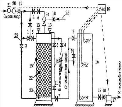 САУ работает следующим образом. Скорость фильтрации фильтровальной установки настраивается незначительно больше минимальной производительности повысительного насоса 17. В связи с этим уровень чистой воды в накопительной емкости 16 медленно поднимается и при достижении отметки УР-1 САУ подает импульс ЭМК 19 на перекрытие исходной воды. По мере расхода чистой воды потребителем уровень воды в накопительной емкости падает и при достижении отметки УР-2 САУ подает импульс ЭМК 19 на открытие. В данном случае система фильтрации начинает накопление чистой воды в емкости. Электрод с отметкой УР-3 является «массой» для системы автоматики и при понижении уровня воды ниже отметки УР-3 САУ дает импульс для остановки работы повысительного насоса 17 во избежание его поломки. Данный вариант возможен при прекращении подачи исходной воды в систему вследствие возможных ремонтных работ на наружных подводящих водоводах или иных технических причин.