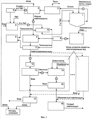– систему подогрева фракций, получаемых в процессе обработки загрязненных грунтов, осадков, нефтесодержащих вод и используемого раствора ТМС, состоящую из узла нагрева 9, замкнутой системы труб с насосами и циркулирующим по ним теплоносителем – воды с температурой 75-95°С, а также двух водоводяных подогревателей: одного 10 – для подогрева раствора ТМС, и другого 11 – для подогрева нефтесодержащих вод.