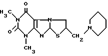 Поставленная цель достигается получением соединения I способом, заключающимся во взаимодействии 8-бромтеофиллина с 2- (N-пиперидинометил)тиираном в среде диметилформамида в присутствии едкого кали при температуре кипения реакционной смеси по схеме (см. в конце описания).