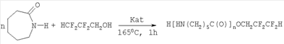 Наиболее близким к предлагаемому изобретению по технической сущности и достигаемому результату является способ получения 1,1,3-тригидроперфторпропиловых эфиров -аминокапроновой кислоты реакцией -капролактама и ПФС1 (прототип) [Ефанова Е.Ю. Диссертация канд. хим. наук. Волгоград, 2002, 156 с. С.133, 139]. Процесс проводят ампульным методом при мольном соотношении -капролактам: ПФС1: ДДКМ как 1:1:0,05, температуре 260°С. Продолжительность реакции составляет 4 часа. Очистку полученного 1,1,3-тригидроперфторпропилового эфира тримера -аминокапроновой кислоты от продуктов разложения катализатора осуществляют перекристаллизацией из уксусной кислоты. Степень превращения 70%, выход олигомера в расчете на вступивший в реакцию -капролактам 50%. Т.пл. 178-187°С.