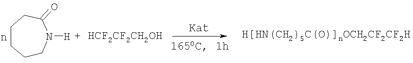 Также известны способы получения эфиров -аминокапроновой кислоты реакцией 1,1,3-тригидроперфторпропилового спирта (ПФС1) и -капролактама в присутствии каталитических количеств N,N-диметилформамида (ДМФА) [Сторожакова Н.А., Ефанова Е.Ю., Рахимов А.И. Реакции полифторированных спиртов теломеров с  -капролактама с ПФС1 проводят при мольном соотношении -капролактам: ПФС1 как 1:1,2 в присутствии каталитических количеств (0,05 моля) ДМФА. Температура реакции 260°С, время реакции 5 часов. Очистку 1,1,3-тригидроперфторпропилового эфира тримера -аминокапроновой кислоты проводят перекристаллизацией из уксусной кислоты. Степень превращения -капролактама 64%, выход олигомера в расчете на вступивший в реакцию -капролактам 81%. Т.пл. 192°С.