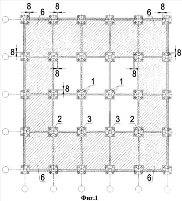 На фиг.1 показан вид свайно-плитного фундамента сверху.