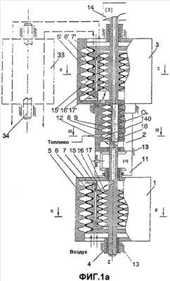 Другими словами, объемной винтовой машиной, используемой для изобретения, является вращательный винтовой двигатель внутреннего сгорания, в котором осуществляется преобразование движения, и в котором непрерывно-циклическое изменение энергии рабочей субстанции происходит синхронно с процессом передачи этой рабочей субстанции через рабочие камеры разных отделений. Объемная винтовая машина, следовательно, вырабатывает энергию рабочей субстанции. Имеются синхронизаторы 11 и 14, которые предназначены для поддержки работы набора 1 и набора 3, соответственно. Они могут быть выполнены в виде единого элемента, как показано на Фиг.1b.