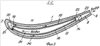 На фиг.3 изображено поперечное сечение С-С сборочного узла Ж РЛ в составе узлов базовой секции Д и накладной секции Е (в составе части 14 пера и пластинчатого дефлектора 15). Секции соединены при сборке таким образом, что точки А* и В* накладной секции совмещаются с точками А и В базовой секции, а дефлекторы 10 и 15 оппозитно расположены во внутренней полости 9 РЛ, причем козырек 19 дефлектора 10 с рядом регулировочных отверстий 20 отделяет часть объема внутренней полости 9 РЛ вдоль входной кромки 5 пера РЛ в виде полости 21 таким образом, что полость 21 сообщается с рядами входных отверстий 12 каналов охлаждения 11 части пера 3 РЛ и с рядами входных отверстий 17 каналов охлаждения 16 части пера 14 РЛ. При соединении секций Д и Е в сборочный узел Ж козырек 22 дефлектора 15 отделяет еще одну часть объема внутренней полости 9, расположенную вдоль выходной кромки 6 пера РЛ в виде полости 23, сообщающейся как с рядами выходных отверстий 13 и 18 комплексов каналов охлаждения 11 и 16, так и с комплексом отверстий 8 выхода из РЛ охлаждающего воздуха. Часть внутренней полости 9 РЛ, ограниченная поверхностями пластинчатых дефлекторов 10 и 15 и козырьков 19 и 22, образует по всей высоте пера РЛ канал 24, сообщающийся с отверстием 7 хвостовика 2 и через отверстия 20 козырька 19 с полостью 21.
