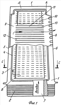 Помимо базовой секции Д в состав РЛ входит изображенная на фиг.2 накладная секция Е, в состав которой входит, в свою очередь, литая часть 14 пера РЛ, замыкающая контур пера по его наружной поверхности, совпадающая по форме и площади общего контакта с окном 4 части пера 3 базовой секции Д РЛ. На внутренней стороне части 14 пера укреплен пластинчатый дефлектор 15, образующий совместно с ней комплекс расположенных эквидистантно, ориентированных в направлении от входной к выходной кромке РЛ каналов 16 охлаждения части 14 пера, каждый с входным 17 и выходным 18 отверстием прохода потока охлаждающего воздуха.