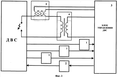 Изобретение может быть успешно реализовано в системе управления ДВС (например, см. Руководство по эксплуатации, техническому обслуживанию и ремонту автомобилей: ВАЗ-2110, ВАЗ-2111, ВАЗ-2112. М.: Ливр, 1998 г., стр.162-167), схематично изображенной на Фиг.2 и включающей в себя, по меньшей мере, датчики 1 параметров ДВС, регулятор 2 холостого хода (с шаговым электродвигателем и соединенным с ним клапаном), блок 3 управления ДВС, в состав которого входят микропроцессор, ОЗУ и ЭСППЗУ, а также катушка 4 зажигания и датчик 5 тока.