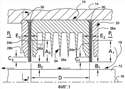 Перепад Р1-Р2 давления, существующий на уровне уплотнения в ходе работы, может быть относительно высоким и составлять, например, свыше около 400 фунтов на квадратный дюйм и может быть существенно выше, чем около 550 фунтов на квадратный дюйм, что является известной в настоящее время максимальной способностью сдерживания перепада давления обычных щеточных уплотнений с двумя или более ступенями с коэффициентом безопасности, равным двум. Как отмечалось выше, обычные щеточные уплотнения не обладают способностью изолировать такие высокие давления без повышенного риска повреждения уплотнений или неустойчивости ротора.