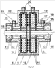 Теплогенерирующий блок 3 состоит из корпуса-статора 8 с двумя камерами 9, 10, внутри которых с возможностью вращения на валах 11 жестко закреплены диски 12. Валы 11 установлены в подшипниковых опорах 13 и уплотнены торцевыми уплотнениями 14, размещенными в камерах 15. На внутренних торцевых поверхностях корпуса-статора 8 и торцевых, и цилиндрических поверхностях дисков 12 выполнены ряды несквозных отверстий 16. На дисках 12 в непосредственной близости от валов 11 выполнены сквозные отверстия 17. В перегородке корпуса-статора 8 соосно валам 11 размещено сквозное отверстие 18. Патрубки для подвода нагреваемой жидкости 19 через камеры 15 для установки торцевых уплотнений 14 связаны с камерами 9, 10, а патрубки для отвода нагретой жидкости 20 установлены на цилиндрической поверхности корпуса-статора 8.