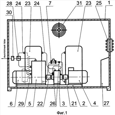 Система охлаждения силовой установки 5 через теплоутилизатор 28 связана с теплообменником 29, размещенным в бойлере-аккумуляторе 23. Выхлопные газы, охлажденные в теплоутилизаторе 28, поступают в нейтрализатор 30 (систему очистки) выхлопных газов.
