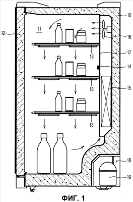 Как показано на фиг.1, холодильник содержит корпус 10, который имеет отделение 11 для переохлаждения и хранения пищевых продуктов и напитков различными способами, и дверь 12 для открытия и закрытия передней стороны отделения 11 для переохлаждения. Отделение 11 для переохлаждения разделено на верхнюю и нижнюю области посредством множества полок 13, так что отдельные типы напитка (например, бутылки или банки с напитками) могут размещаться на полках 13 в соответствующих областях. Отделение 11 для переохлаждения предусмотрено на одном участке стенки с датчиком 14 температуры для регистрации температуры отделения 11 для переохлаждения, чтобы поддерживать температуру в отделении 11 для переохлаждения постоянной (например, -8°C), обеспечивая хранение напитков в переохлажденном состоянии.