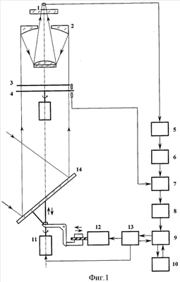 На фиг.2 изображена блок-схема управления сканирующим зеркалом 14. Оно обеспечивает полный оборот вокруг своей оси, т.е. полное круговое сканирование по углу за доли секунды. За это время регистрируется N значений энергетической яркости облачного поля (например, 1440) через интервалы, соответствующие мгновенному полю зрения прибора. После завершения записи данных поступает сигнал на шаговый двигатель 12 (фиг.1) и зеркало по заданной программе меняет угол наклона  (от десятков минут до единиц градусов) на следующий шаг, цикл повторяется. После следующего оборота угол меняется еще на  . Через заданное количество шагов (строк), например 17, шаговый двигатель 12 возвращает сканирующее зеркало 14 в исходное начальное положение. Если по такому изображению форма облачности надежно не определена, цикл повторяется и записывается следующий кадр. Таким образом, для оптимизации измерений получаем набор матриц, где по горизонтали N значений, а по вертикали М (заданное нами количество строк). Каждое из M·N значений представляет собой конкретную область – изображение в ИК-области на небесной сфере, либо часть полусферического изображения облачного поля, либо полное изображение полусферы, если это необходимо для процедуры распознавания форм облачности.