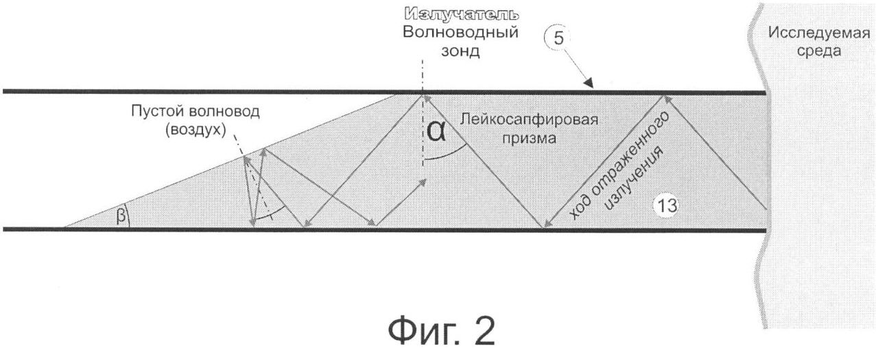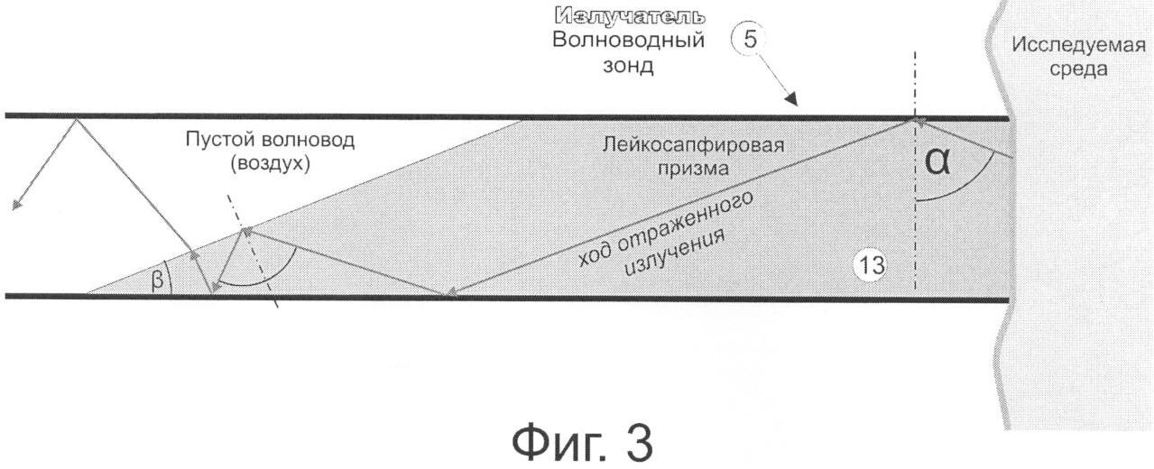 Схема прохода отраженной волны H01 второй гармоники (отвечающей условию ·k2>>(m /b)2+(n /a)2) излучения СВЧ-генератора на диоде Ганна из лейкосапфировой косоугольной призмы на торце волноводного зонда в пустой волновод представлена на фиг.3. Все другие распространяющиеся моды на границе наклонной грани призмы и пустого волновода имеют такие углы падения, что испытывают внутреннее отражение и в волноводный тракт не проходят (фиг.2). Зондирующее излучение, во избежание загромождения рисунка, не представлено. Так как для проходящей в волновод отраженной моды угол между направлением распространения отраженной моды и траверзом волновода « », равный arcsin (h/ ·k), близок к 90°, то волна H01 распространяется от исследуемой среды до отражения от наклонной плоскости призмы практически горизонтально, подобно плоской поперечной волне в свободном пространстве.