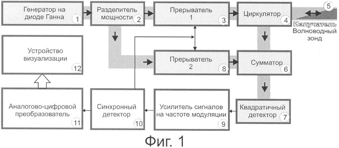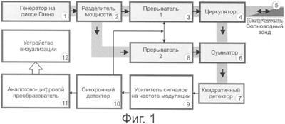 Устройство содержит СВЧ-генератор на диоде Ганна 1, который соединен с разделителем мощности 2, от него зондирующий сигнал через последовательно соединенные первый прерыватель 3 и циркулятор 4 поступает в волноводный зонд 5, отражается от исследуемого материала, через тот же циркулятор 4 поступает в сумматор 6, и далее – на квадратичный детектор 7. Опорный сигнал поступает в сумматор 6 через второй прерыватель 8. Из сумматора 6 СВЧ-сигнал поступает на квадратичный детектор 7, где он детектируется. От квадратичного детектора 7 модулированный низкой частотой модуляции сигнал через усилитель 9, усиливающий сигналы на частоте модуляции, через синхронный детектор 10 поступает на аналого-цифровой преобразователь (АЦП) 11, и далее – на устройство визуализации 12 (например, монитор компьютера). Синхронный детектор на частоте модуляции управляет открытием и закрытием двух прерывателей (p-i-n диодов). Двойной линией со стрелкой между линиями указан путь СВЧ-сигнала в волноводе, одинарной стрелкой – направление низкочастотного продетектированного сигнала в электрическом кабеле.