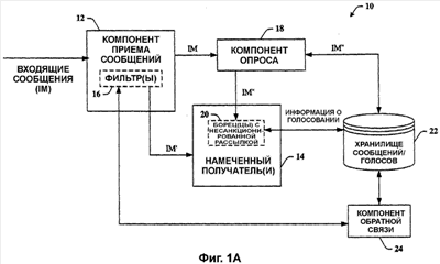 Обратимся теперь к фиг.1A, где проиллюстрирована общая блок-схема обучающей системы 10 обратной связи в соответствии с аспектом настоящего изобретения. Компонент 12 приема сообщений принимает и доставляет входящие сообщения (обозначаемые как IM) намеченным получателям 14. Компонент приема сообщений может включать в себя, по меньшей мере, один фильтр 16, что является обычным в случае многих компонентов приема сообщений (к примеру, фильтр бесполезной почты), чтобы уменьшить доставку нежелательных сообщений (к примеру, несанкционированной рассылки). Компонент 12 приема сообщений вместе с фильтром 16 обрабатывает сообщения (IM) и предоставляет отфильтрованный поднабор сообщений (IM’) намеченным получателям 14.