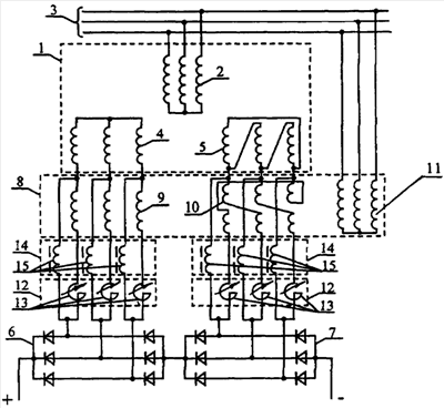 Вольтодобавочный трансформатор 8 имеет две трехфазные вторичные обмотки 9 и 10, соединенные в каждой фазе с соответствующими вторичными обмотками 5 преобразовательного трансформатора 1, и одну трехфазную первичную обмотку 11, подключенную к питающей сети,