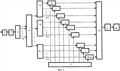 В блоке 1 производится разбиение на перекрывающиеся массивы так, что после умножения на «окно» при сложении получается исходная последовательность. При этом в зависимости от типа применяемого окна и коэффициента перекрытия последовательность может иметь паразитно-амплитудную модуляцию (ПАМ), что приводит к некоторому ухудшению чувствительности устройства. При построении устройства выбором коэффициента перекрытия контролируют уровень ПАМ допустимой величины снижения чувствительности устройства. В блоке 2 проводится умножение на «окно», т.е. обеспечивается требуемая избирательность блока защиты. При проектировании выбирается «окно» с соответствующими спектральными свойствами, обеспечивающими необходимый динамический диапазон по защите от сосредоточенных помех («Использование окон при гармоническом анализе методом дискретного преобразования Фурье». Ф.Дж.Хэррис, ТИИЭР, т.66, №1, январь 1978 г.). В блоке 3 производится вычисление БПФ взвешенных с «окном» массивов. Каждый отсчет на выходе блока БПФ 3 соответствует своей частоте блока режекции узкополосных помех 4. Блок 4 осуществляет режекцию узкополосных помех традиционными алгоритмами. В каждом блоке БПФ 51-5N происходит вычисление последовательности с каждого выхода блока режекции узкополосных помех 4 на интервале сигнала. С N1 выходов каждого блока БПФ сигнал поступает на входы перемножителей 6, количество которых равно N·N1, на вторые входы которых с блока 7 поступают отсчеты комплексно-сопряженной копии. В блоках 6 производится умножение на комплексно-сопряженную копию. Полученное произведение в блоке ОБПФ 8 преобразуется во временную область. В блоке 9 вычисляются модули взаимокорреляционной функции. С блока вычисления модуля 9 сигнал поступает в устройство обнаружения 10, где производится поиск сигнала по традиционному алгоритму.
