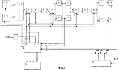 Блок управления 22 содержит (фиг.2) процессор 27 и аналого-цифровой преобразователь (АЦП) 26, выход которого соединен с входом процессора 27, и генератор опорного напряжения 35 на (+2,5 В). Вход генератора опорного напряжения 35 подключен к первому выходу (+6v) автономного блока питания 24, первый выход соединен с седьмым входом АЦП 26, а второй выход служит для подачи номинала 2,5 v на блоки 2, 4, 7, 8, 10, 15, 17 и 25.
