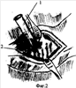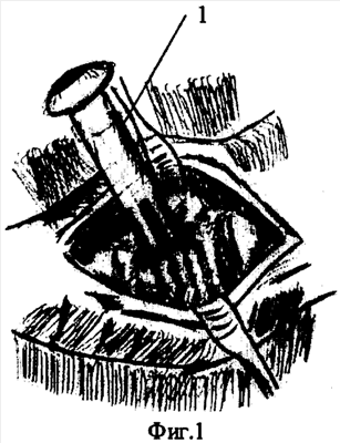Далее накладывают провизорные швы следующим образом. Вкол иглы производят на расстоянии 5 мм от троакара со стороны слизистой двенадцатиперстной кишки под углом 90° через специально созданные прорези в гильзе троакара, острие иглы достигает стенки кисты (фиг.2), и выкол производят «скользя» в прорезях гильзы троакара из просвета кисты (фиг.3). Таким образом накладывают 4 шва по противоположным сторонам окружности гильзы троакара (2). После чего гильзу извлекают (фиг.4).