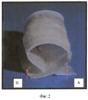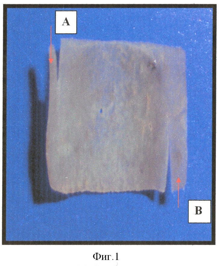 фиксация тимпанального лоскута над тимпанальным устьем слуховой трубы заключается в том, что из аутохряща с помощью резака делают ультратонкую полоску хряща толщиной 0,2-0,3 мм прямоугольной формы, которую сворачивают в трубку. Учитывая упругость хряща и вероятность его разворачивания, мы фиксируем края хряща с помощью «замка». Суть данного «замка» заключается в наложении направленных друг к другу разрезов по краю двух параллельных сторон до середины хрящевой полоски с образованием двух лоскутов А и В (фиг.1). После скручивания полоски хряща в трубку и сопоставления разрезов лоскуты А и В фиксируют данную трубку (фиг.2). Таким образом, трубка из ультратонкого аутохряща подводится к тимпанальному устью слуховой трубы под тимпанальный лоскут. Наличие просвета трубки не нарушает вентиляционную и дренажную функции слуховой трубы, что очень важно в послеоперационный период, а сама конструкция предотвращает западение тимпанального лоскута над тимпанальным устьем слуховой трубы.