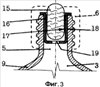 В наборе для антисептической обработки устройство для переноса антисептической жидкости на раневую поверхность выполнено в виде одноразового тампона 15 из гигроскопичного материала. Тампон 15 вставляется в специальный держатель 16. Таким образом обеспечивается гигиеничность обработки раневых поверхностей, когда один и тот же набор может использоваться не только индивидуально для одного человека, но и для целого коллектива, например для школьной футбольной команды. Все дело в том, что после использования – индивидуального или для другого человека – тампон 15 выбрасывается и при необходимости используется следующий одноразовый тампон 15, который вынимается из дополнительной полости 4 емкости 1. В остальном набору также присущи признаки входящего в него двухкамерного сосуда, которые описаны выше.