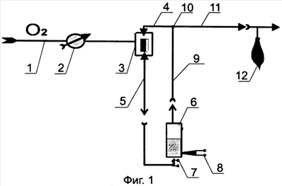 Для удобства рассмотрения материалов заявки вначале опишем устройство, реализующее способ дозирования анестетиков, которое состоит из линии общего потока 1 газа-носителя с вентилем 2, клапана 3 с таймером разделения общего потока газа-носителя и подачи его попеременно по двум линиям (на фиг. не показан), первой линии 4, разделенного потока газа-носителя и второй линии 5 разделенного потока газа-носителя, испарителя 6 с подогревателем 7 и датчиком температуры 8, линии 9 второго разделенного потока газа-носителя, насыщенного парами анестетика, камеры объединения и смешения 10 двух разделенных потоков, линии подачи 11 объединенного потока газа-носителя с требуемой объемной концентрацией паров анестетика для конкретного больного.