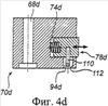 На фиг.4d проиллюстрирован вариант выполнения, в котором стопорный винт 110 закреплен в сегменте 78d, a не в держателе 70d уплотнения, а сквозное отверстие 94d держателя уплотнения в радиальном направлении расширения превышает по размеру диаметр стопорного винта 110. Таким образом, если смотреть в радиальном направлении, то поверхность 112 наружного торца отверстия 94d входит в соприкосновение со стопорным винтом 110 и тем самым предотвращает выпадение сегмента 78d из паза 74d тогда, когда крышка не помещена в сосуд высокого давления. К стопорному винту 110 легко дотянуться, и его можно завинтить и вывинтить из сегмента 78d через отверстие 94d в держателе 70d уплотнения.