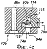 На фиг.4е показан другой вариант выполнения, в котором радиальное перемещение ограничено той же пружиной 114, оказывающей давление в радиальном направлении. До пружины 114 можно дотянуться через сквозное отверстие 94е в держателе уплотнения и зафиксировать ее крепежными средствами 116, 118, например крючками и проушинами, одним концом к сегменту 78е, а другим концом к стенке 90е, задающей границы паза держателя 70е. Таким образом, пружина 114 удерживает сегменты 78е в пазе 74е и тогда, когда крышка не находится в закрытом положении на камере высокого давления.