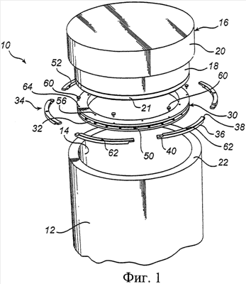 Фиг.1 представляет собой покомпонентный вид в аксонометрии верхней части изостатического пресса 10, выполненного в соответствии с одним вариантом выполнения данного изобретения. Изостатический пресс 10 содержит сосуд 12 высокого давления в форме цилиндра, внутренняя поверхность 14 цилиндрической стенки которого задает границы камеры высокого давления, в которой размещают одно или несколько изделий, которые должны подвергнуться обработке высоким давлением. Камеру высокого давления заполняют газом под высоким давлением и при высокой температуре. Горячий газ поднимается вверх в камере высокого давления, которая при обработке давлением закрыта крышкой 16.