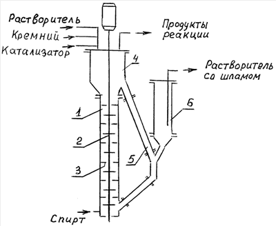 В реактор синтеза (1) загружают растворитель, контактную массу, состоящую из кремния и катализатора, включают перемешивающее устройство и после достижения заданной температуры в нижнюю часть реактора подают спирт. Лопастная мешалка (2) обеспечивает диспергирование парогазовых пузырей, поддерживает во взвешенном состоянии частицы кремния и катализатора, а также создает интенсивный восходящий поток реакционной массы, которая поступает в парожидкостной сепаратор (4). В парожидкостном сепараторе продукты реакции выделяют из реакционной массы и в парогазовом состоянии выводят из реактора, а реакционная масса по циркуляционной трубе (5) возвращается в нижнюю часть реактора.