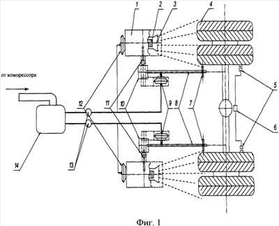 Устройство (фиг.1 – общая схема автоматического устройства для улучшения сцепных и тормозных качеств буксующих колес на скользких несущих поверхностях, фиг.2 – принципиальная схема привода механизма подачи сыпучего материала под буксующее ведущее колесо) включает в себя бункер 1 для хранения сыпучего материала (песка, шлака), в днище которого имеются окна с регулировочной колонкой 20; направляющий желоб 3; электромагнитный клапан 13, обеспечивающий подачу воздуха из ресивера 14 в тормозную камеру 12 со штоком, имеющую рейку 15 и шестерню 16, вращающие ворошитель 18, расположенный внутри бункера 1, а также в тормозную камеру 9 со штоком, прижимающим ведущий вал 8 с жестко закрепленным на нем роликом 7 к ведущему колесу 4; конический редуктор 10, передающий вращение ведущего вала 8 на ведомый карданный вал 11, связанный с крыльчаткой 2; сравнитель угловых ускорений 6 с индуктивным датчиком 5, установленным на ведущем колесе. На корпусе конического редуктора 10 установлены полуоси 19, обеспечивающие его перемещение в горизонтальной плоскости. Устройство легко монтируется и демонтируется с нижней площадки кузова 21 за счет салазок 17.