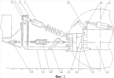 При приведении тягово-догрузочного устройства в действие золотник гидрораспределителя гидроцилиндра 17 навески тягача включают в позицию “плавающее”. При необходимости увеличивают длину верхней тяги 3 переменной длины до тех пор, пока кузов полуприцепа займет горизонтальное положение относительно поверхности площадки, на которой производят агрегатирование. При этом часть веса полуприцепа через ответный элемент 2, сцепной элемент 1, верхнюю тягу 3 переменной длины, нижние тяги 6, шарниры Гука 4 и 7, кронштейн 11, ползун 8, станину 9 передают на тягач 12.