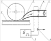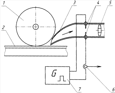 На чертеже изображена принципиальная схема варианта реализации предлагаемого способа в виде устройства датчика для определения боксования ведущих колес. Устройство датчика, определяющего наличие боксования металлического ведущего колеса 1, катящегося по рельсу 2, состоит из корпуса воздухоприемника 3, входное отверстие которого расположено у места контакта колеса 1 с рельсом 2, электродов 4, встроенных в корпус воздухоприемника и вентилятора 5, размещенного в том же корпусе. Электроды 4 соединены последовательно с датчиком наличия тока 6 и подсоединены к генератору импульсов высокого напряжения 7. Датчик наличия тока в цепи электродов может быть любого известного типа – резистивного, трансформаторного и т.п.