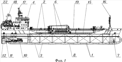 Пассивные системы гашения колебаний как танкера в целом за счет использования скуловых килей, так и жидкости, находящейся в танках, за счет использования гофрированных переборок 13 и 14 и выполнение палубного перекрытия 15 с силовым набором, выполненного, например, из полособульба, расположенным со стороны танков 2, разбивки пространства на количество танков 2 от 8 до 32 для снижения совпадения частоты собственных колебаний находящейся в каждом танке жидкости, повышенная гибкость (податливость) трубопроводов 5 и продольного коридора (переходного мостика) 19, предназначенного для перехода с палуб надстройки к носовой оконечности танкера-химовоза, за счет снижения напряжений, возникающих в местах соединения палубы 15 с элементами трубопроводов 5, позволяют повысить безопасность преодоления танкером-химовозом открытых и закрытых морей с высотой волн, по расчетам авторов, до 7 метров. Заполнение балластных отсеков 3 в днище и бортах забортной водой позволяет повысить остойчивость танкера-химовоза, а следовательно, и безопасность его движения с пустыми танками.