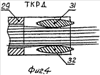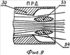 3. Вертикальный взлет самолета. ТРД выводят на максимальные обороты, при этом его реактивная струя (существенно ослабленная на многоступенчатой турбине 18), истекая через сопло 29, «упирается» в газовые рули 31 и 32 и делится при этом на две струи, направленные – одна – вверх, а другая – вниз. Таким образом реактивная тяга ТРД нейтрализуется давлением газа на газовые рули и истечением газа в двух противоположных направлениях – фиг.6.
