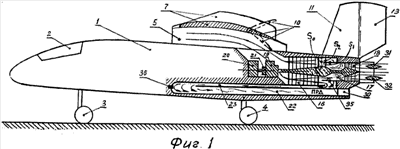 Самолет включает фюзеляж 1 с кабиной экипажа 2, стойкой передних колес 3 и задних колес 4. По бокам фюзеляжа закреплены два дугообразных, в поперечной плоскости самолета, газоотражающих крыла 5 и 6, выпуклая сторона которых обращена вверх, а вогнутая – вниз; крылья установлены с углом атаки относительно продольной оси самолета. Сверху фюзеляжа закреплено нормальное крыло 7, на концах которого шарнирно установлены элероны 8 и 9, в центре крыла установлен закрылок 10, на хвостовой части фюзеляжа закреплены два стабилизатора 11 и 12, на которых установлены (совмещенные по функциям) рули высоты и поворота 13 и 14. В задней части фюзеляжа размещен турбореактивный двигатель 15 с компрессором 16, камерой сгорания 17 и многоступенчатой турбиной 18. Впереди компрессора установлен агрегатный блок 19 и пусковой двигатель 20 (автомобильного типа), который соединен с агрегатным блоком и двигателем посредством центробежной муфты сцепления 21.