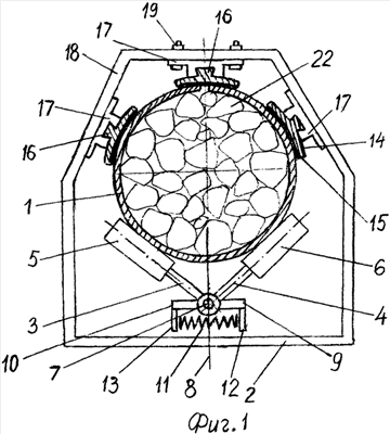 Трубчатый ленточный конвейер содержит бесконечно замкнутую на приводном и натяжном барабанах (не показаны) гибкую ленту 1, закрепленные на раме 2 и установленные с одинаковым шагом по длине средней части става конвейера опоры для ленты, которые выполнены из размещенных под лотком ленты 1 трубчатой формы консольно установленных на угловых рычагах 3 и 4 под углом друг к другу парных роликов 5 и 6. Угловые рычаги 3 и 4 каждой пары роликов 5 и 6 размещены на одной оси 7, ориентированной вдоль продольной оси 8 конвейера, а свободные концы 9 и 10 угловых 3 и 4 рычагов подпружинены друг к другу спиральной пружиной 11 растяжения или сжатия. Пружина 11 закреплена своими концами на концах 9 и 10 рычагов 3 и 4 с помощью кронштейнов 12 и 13, ориентированных вертикально вниз. Верхняя часть трубчатого лотка ленты 1 формируется с помощью ориентированных вдоль продольной оси 8 конвейера пластин 14, спрофилированных по дуге окружности радиуса, равного радиусу трубчатого лотка ленты 1. Поверхность каждой пластины 14 со стороны ленты 1 покрыта слоем 15 антифрикционного материала, а с наружной стороны пластина 14 выполнена с выступом 16 в виде ласточкина хвоста с возможностью его взаимодействия с впадиной соответствующей формы на обойме 17, закрепленной на стойке 18 рамы 2 конвейера с помощью болтов 19. При этом кромки пластин 14 со стороны ленты 1 выполнены с закруглениями 20, а смежные пластины 10 размещены встык друг к другу с минимальными зазорами 21. 22 – транспортируемый груз.
