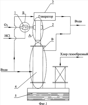 2. Устройство для осуществления способа по п.1, состоящее из камеры подготовки газовой смеси хлорида водорода и кислорода, плазмохимического реактора для получения хлора в смеси с водой, генератора высоковольтных импульсов, устройства для разделения смеси на хлор и воду, накопительной емкости для реакционной воды, при этом реактор выполнен в виде металлического цилиндра, внутри которого коаксиально установлен между верхним и нижним изоляторами металлический стержень, верхний изолятор закреплен жестко между двумя фланцами, в верхнем изоляторе закреплена клемма для подвода к стержню положительного заряда, нижняя часть стержня закреплена через центрирующую втулку на нижнем изоляторе с возможностью свободного перемещения стержня вместе с изолятором в осевом направлении, нижний изолятор перфорирован отверстиями для прохода активизированной газовой смеси, а на выходе из плазмохимического реактора установлена перфорированная отверстиями решетка, выполненная из графитофторопласта.