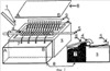 Фиг.4. Перегретый водяной пар через трубку 5 подается в замкнутый теплоизолированный ящик 3 при температуре плавления стекла 950-1200°С. Часть пара 9 проходит через ящик со стеклом 2, плавит стекло и выходит наружу через регулируемый клапан 4. Другая часть пара выдувает одновременно множество пузырей различного диаметра в расплавленном стекле 2, которые продавливаются через отверстия в плите 1. Стальной скребок 6, покрытый легкоплавким веществом, срезает надутые стеклянные пузыри 7 с поверхности плиты и направляет их в нагретый до 800°С стальной ящик (форму) 8, стенки которого покрыты легкоплавким веществом. Далее как по фиг.1.
