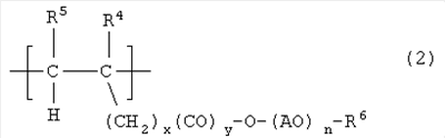 где R4 и R5 являются одинаковыми или различными и представляют собой атом водорода или метильную группу, АО представляет собой один тип оксиалкиленовой группы, характеризующейся количеством атомов углерода в диапазоне от 2 до 4, или смесь двух или более типов оксиалкиленовых групп, и в случае двух или более типов данных групп их можно присоединять в виде блока или произвольным образом, х представляет собой число в диапазоне от 0 до 2, y представляет собой 0 или 1, n является средним количеством присоединяемых молей оксиалкиленовой группы и представляет собой число в диапазоне от 1 до 300, a R6 представляет собой атом водорода или углеводородную группу, характеризующуюся количеством атомов углерода в диапазоне от 1 до 20.