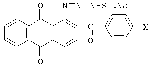 Синтез исходных 1-(триазен-N-сульфонат)-2-ароилантрахинонов, используемых для получения 7,8-фталоилакридонов, осуществляют следующим образом. Пример 3. 1-(Триазен-N-сульфонат)-2-ароилантрахинон. Раствор 3,27 г (0,01 моль) 1-амино-2-ароилантрахинона в 100 мл уксусной кислоты диазотируют при 5-10°С в течение 2 часов, раствором нитрозилсерной кислоты, приготовленной из 0,83 г (0,012 моль) нитрита натрия и 10 мл 95% серной кислоты. Затем реакционную массу разбавляют 10-15 мл воды, добавляют активированный уголь и отфильтровывают от примеси. Затем в фильтрат при перемешивании и охлаждении прибавляют 1,43 г (0,012 моль) натриевой соли сульфаминовой кислоты и 0,098 г (0,012 моль) ацетата натрия. Выдерживают 15-20 минут при перемешивании, затем реакционную смесь разбавляют 100-150 мл холодной воды, выпавшие кристаллы 1-(триазен-N-сульфонат)-2-ароилантрахинона отфильтровывают, промывают на фильтре холодной водой, сушат при комнатной температуре. Выход продукта составил 4,07 г (89%). Тпл=121°С. Найдено, %: N 9,31, 9,12; S 6,88, 7,09. C21H12N3O6SNa. Вычислено, %: N 9,19; S 7,00. Синтез остальных 1-(триазен-N-сульфонат)-2-ароилантрахинонов проводится в аналогичных условиях. Характеристики полученных соединений приведены в таблице 2. Полученные производные 7,8-фталоилакридона находят применение в качестве красителей для различных полимерных материалов и полиэфирных волокон.