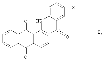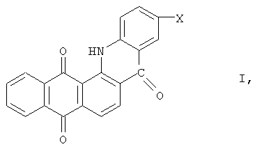 где Х – водород, галоген или низший алкил который заключается в том, что 1-(триазен-N-сульфонат)-2-ароилантрахинон общей формулы II где Х имеет вышеуказанные значения, кипятят в этиленгликоле или диэтиленгликоле в присутствии щелочи при температуре 190-245°С. Полученную массу охлаждают, нейтрализуют уксусной кислотой, осадок отфильтровывают, промывают на фильтре водой и получают чистый продукт. Сущность изобретения: продукт: производные 7,8-фталоилакридона формулы I