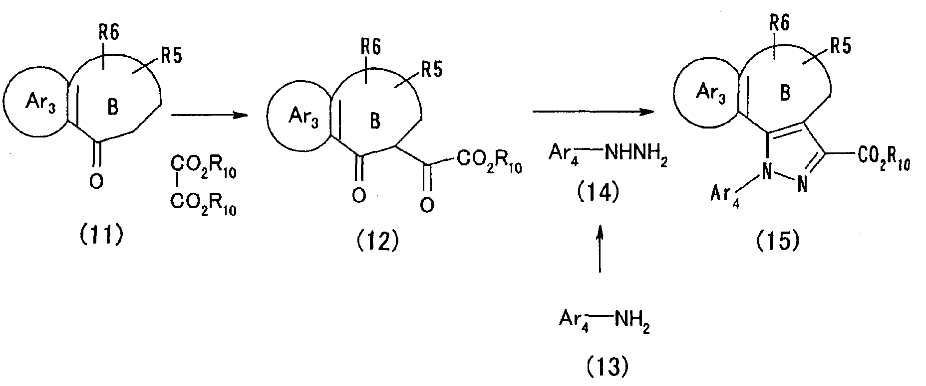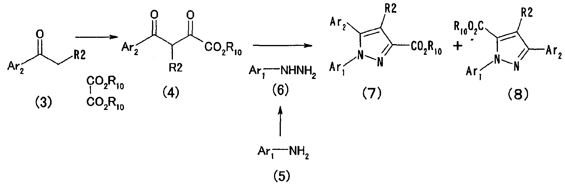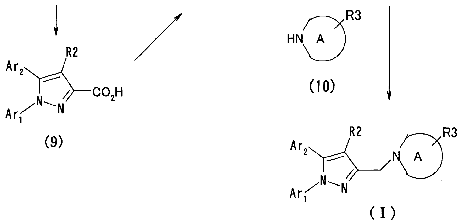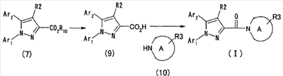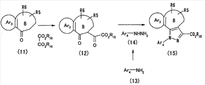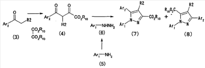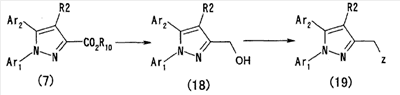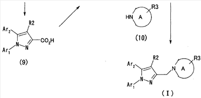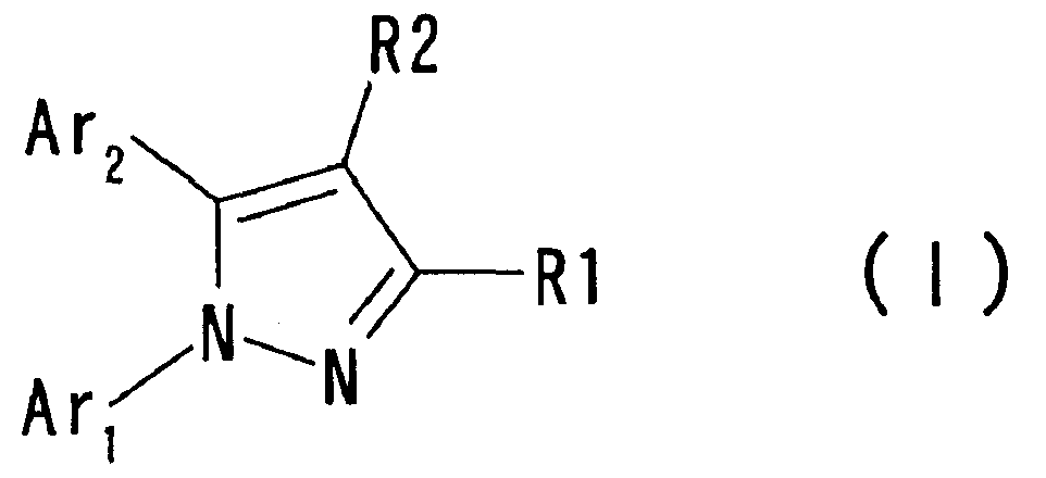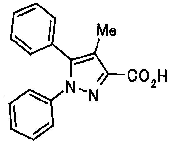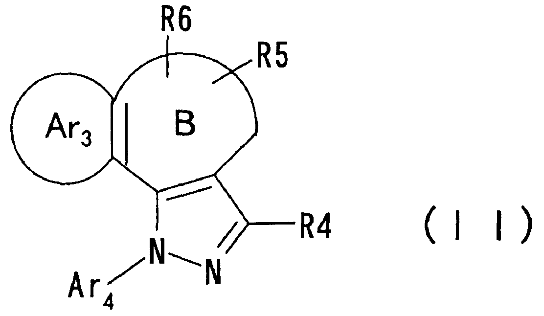 Настоящее изобретние относится к производным пиразола, обладающим активностью, ингибирующей агрегации тромбоцитов. Тромбоциты играют важную роль в остановке кровотечения, вызванного повреждением кровеносного сосуда, посредством коагуляции с образованием тромбов. С другой стороны, известно, что когда васкулярный эндотелий поврежден или кровеносный сосуд сужен, как в случае артериосклероза, тромбоциты агрегируют и запускают образование тромба или эмбола, вызывающего ишемические заболевания, такие как инфаркт миокарда, стенокардия, ишемическое цереброваскулярное нарушение и периферическое васкулярное заболевание. Поэтому ингибиторы агрегации тромбоцитов вводят для профилактики и лечения таких ишемических заболеваний. Аспирин является одним таким ингибитором агрегации тромбоцитов, который использовали в течение продолжительного времени, и действия аспирина были продемонстрированы АРТ (Antiplatelet Trialist’ Collaboration), в котором результаты клинических испытаний, полученных при введении аспирина 100000 пациентам, подвергали метаанализу (BMJ, vol. 308, pages 81-106, 1994). Однако известно, что аспирин вызывает побочные действия, такие как кровотечение в желудочно-кишечном тракте или подобных органах, а именно так называемую «вызванную аспирином язву», и такое побочное действие является доза-зависимым и имеет место при частоте заболевания приблизительно 1 случай на 100 пациентов (BMJ, vol. 321, pages 1183-1187, 2000). Известно, что ингибирующее действие аспирина на агрегацию тромбоцитов основано на активности его ингибировать действие циклооксигеназы. Циклооксигеназа включает в себя циклооксигеназу-1 (СОХ-1) и циклооксигеназу-2 (СОХ-2), и аспирин специфически ингибирует СОХ-1 при низкой дозе, что приводит к ингибированию агрегации тромбоцитов. Ингибирование СОХ-1 вызывает также индуцированную аспирином язву (Neurology, vol. 57, Suppl. 2, pages S5-S7, 2001 and Drugs Today, vol. 35, pages 251-265, 1999). Помимо этого, известно, что нестероидные противовоспалительные лекарственные средства проявляют противовоспалительное действие посредством селективного ингибирования СОХ-2. Как описано выше, хотя аспирин является применимым в качестве ингибитора агрегации тромбоцитов, он вызывает побочное действие в виде желудочно-кишечной дисфункции, приписываемой СОХ-1-ингибирующему действию, которое является механизмом действия ингибирования агрегации тромбоцитов, и имеется существенная потребность в новых ингибиторах агрегации тромбоцитов, не проявляющих активность в ингибировании СОХ-1. Между тем в качестве производных пиразола, обладающих антитромботической активностью, были известны соединение (А) (патент Японии № 2586713 и Chem. Pharm. Bull., vol. 45, pages 987-995, 1997) и соединение (В) (BMJ, vol. 321, pages 1183-1187, 2000). Соединение (А), однако, обнаруживает величину IC50 5,3х10-6 М против индуцированной коллагеназой агрегации тромбоцитов и даже более сильную ингибирующую активность обнаруживает против СОХ-2 (IC50 2,4 х 10-7 М). Ситуация является сходной со случаем соединения (В). Активность по ингибированию агрегации тромбоцитов соединения (В) не является такой сильной, как его ингибирующая активность против СОХ-2. Как описано выше, ингибирование СОХ-2 может привести к противовоспалительному действию, а ингибирование СОХ-2 не обязательно является благоприятным для соединения в качестве ингибитора агрегации тромбоцитов. С точки зрения ситуаци
