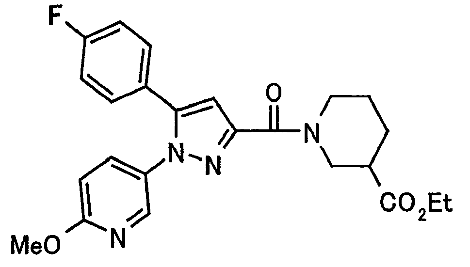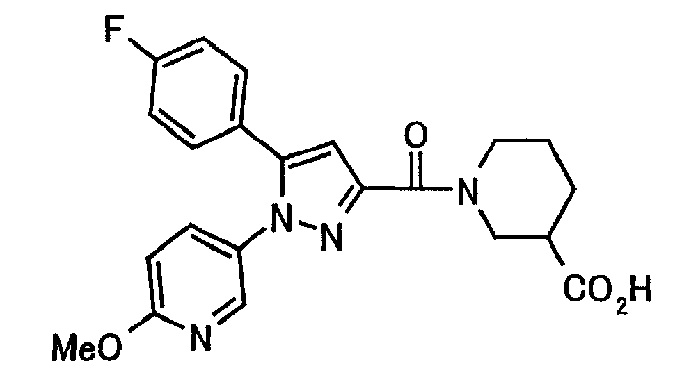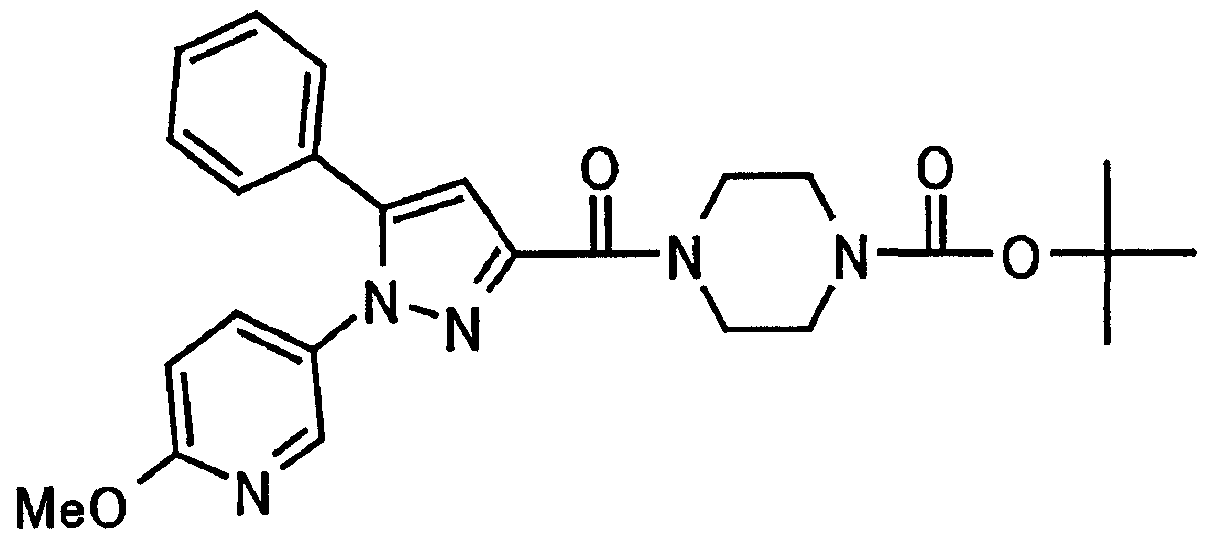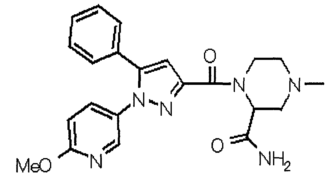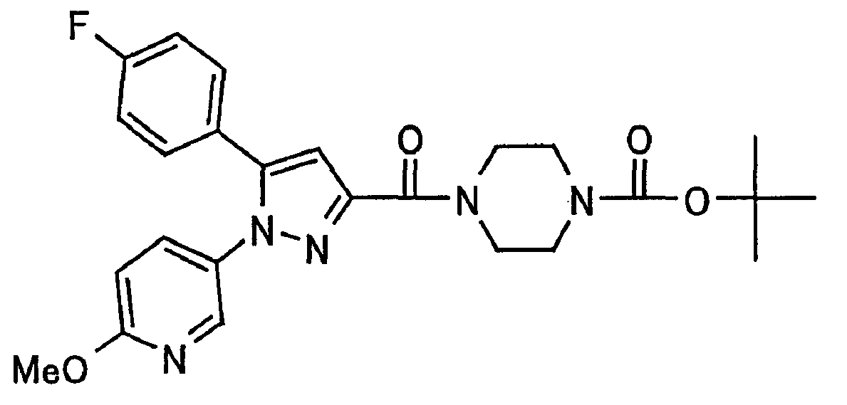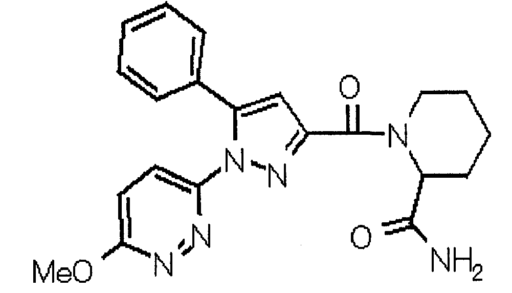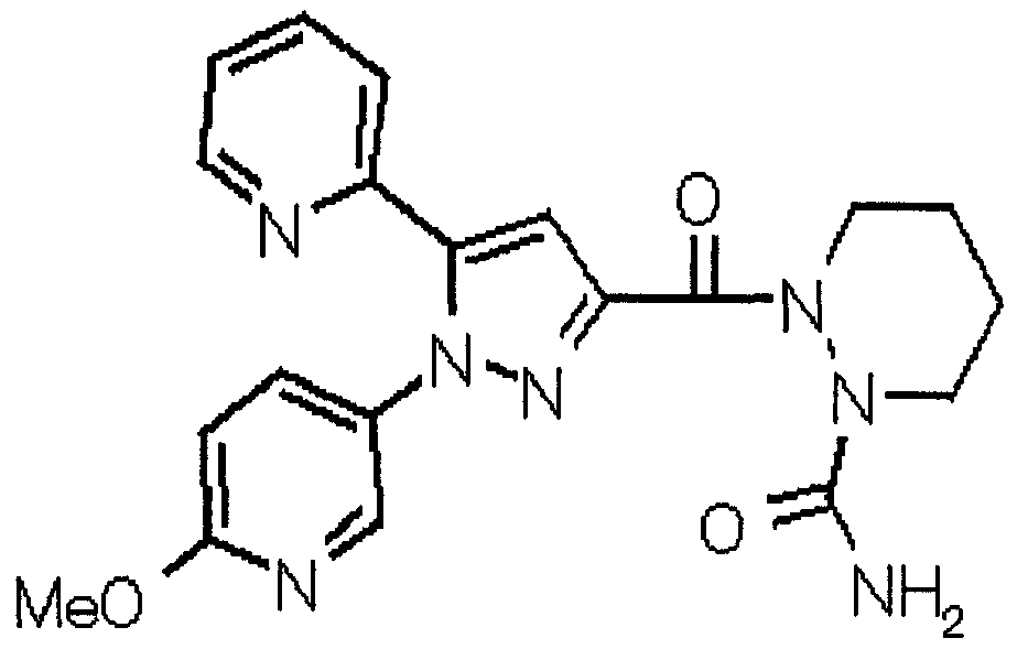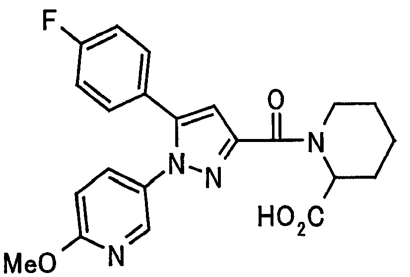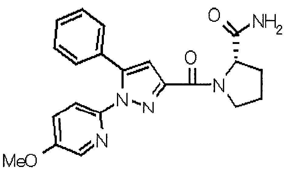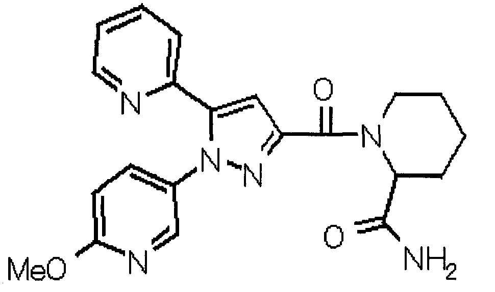 N-Бензилоксипиперидин-2-карбоновую кислоту (2,0 г), 1-гидроксибензотриазол (1,6 г) и гидрохлорид 1-(3-диметиламинопропил)-3-этилкарбодиимида (2,3 г) растворяют в метиленхлориде (20 мл). К образовавшемуся раствору при комнатной температуре добавляют концентрированный водный аммиак (3 мл) и триэтиламин (2 мл) с последующим перемешиванием в течение 3 дней. Реакционную смесь распределяют между водой и метиленхлоридом. Органический слой сушат над безводным сульфатом магния с последующим фильтрованием. Растворитель выпаривают при пониженном давлении. К остатку в метаноле (30 мл) добавляют 10% палладий на угле (1 г, 50% влаги) и образовавшуюся смесь перемешивают в атмосфере водорода в течение 20 часов. Катализатор удаляют фильтрованием. Растворитель выпаривают при пониженном давлении и полученный таким образом масляный продукт сушат, получая при этом указанное в заголовке соединение в виде твердого вещества (970 мг, количественный выход). МС (ESI) m/z: 128 (М+). [Ссылочный пример 132] Метиламид пиперидин-2-карбоновой кислоты Общую процедуру ссылочного примера 131 повторяют с применением N-бензилоксипиперидин-2-карбоновой кислоты (2,0 г) и 1,0 М метиламина в тетрагидрофуране (4 мл), получая при этом указанное в заголовке соединение в виде маслянистого продукта (970 мг, количественный выход). МС (ESI) m/z: 142 (М+). [Ссылочный пример 133] Диметиламид пиперидин-2-карбоновой кислоты Общую процедуру ссылочного примера 131 повторяют с применением N-бензилоксипиперидин-2-карбоновой кислоты (6,4 г) и гидрохлорида диметиламина (2 г), получая при этом указанное в заголовке соединение в виде маслянистого продукта (3,8 г, количественный выход). МС (ESI) m/z: 156 (М+). [Ссылочный пример 134] Этиловый эфир 4-(4-фторфенил)-2,4-диоксобутановой кислоты Общую процедуру ссылочного примера 3-1) повторяют с применением 4′-фторацетофенона (3,0 г) и диэтилоксалата (5,9 мл), получая при этом указанное в заголовке соединение в виде твердого вещества (3,12 г, 60%). 1H-ЯМР (400 МГц, CDCl3) МС (ESI) m/z: 239 (М+1)+. [Ссылочный пример 135] Этиловый эфир 5-(4-фторфенил)-1-(6-метокси-3-пиридил)пиразол-3-карбоновой кислоты Общую процедуру ссылочного примера 3-2) повторяют с применением 5-гидразино-2-метоксипиридина (1,0 г), полученного в ссылочном примере 2, и этилового эфира 4-(4-фторфенил)-2,4-диоксобутановой кислоты (1,88 г), полученного в ссылочном примере 134, получая при этом указанное в заголовке соединение в виде маслянистого продукта (2,12 г, 86%). 1H-ЯМР (400 МГц, CDCl3) МС (EI) m/z: 341 (М+). [Ссылочный пример 136] 5-(4-Фторфенил)-1-(6-метокси-3-пиидил)пиразол-3-карбоновая кислота Водный 1 н. гидроксид натрия (1,2 л) добавляют к этиловому эфиру 5-(4-фторфенил)-1-(6-метокси-3-пиридил)пиразол-3-карбоновой кислоты (164 г) в метаноле (1,6 л) и образовавшуюся смесь перемешивают при комнатной температуре в течение 5 часов. Растворитель реакции удаляют при пониженном давлении и остаток распределяют между водой и диэтиловым эфиром. рН водного слоя регулируют при значении 2 посредством добавления водной 1 н. хлористоводородной кислоты (1,5 л) и осажденные кристаллы растворяют в хлороформе. Образовавшийся раствор распределяют с применением насыщенного раствора соли и органический слой сушат над безводным сульфатом натрия с последующим фильтрованием. Растворитель выпаривают при пониженном давлении и осажденные кристаллы из диэтилового эфира выделяют фильтрованием, получая при этом указанное в заголовке соеди