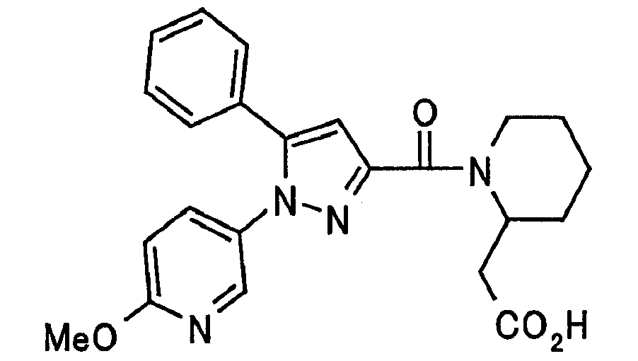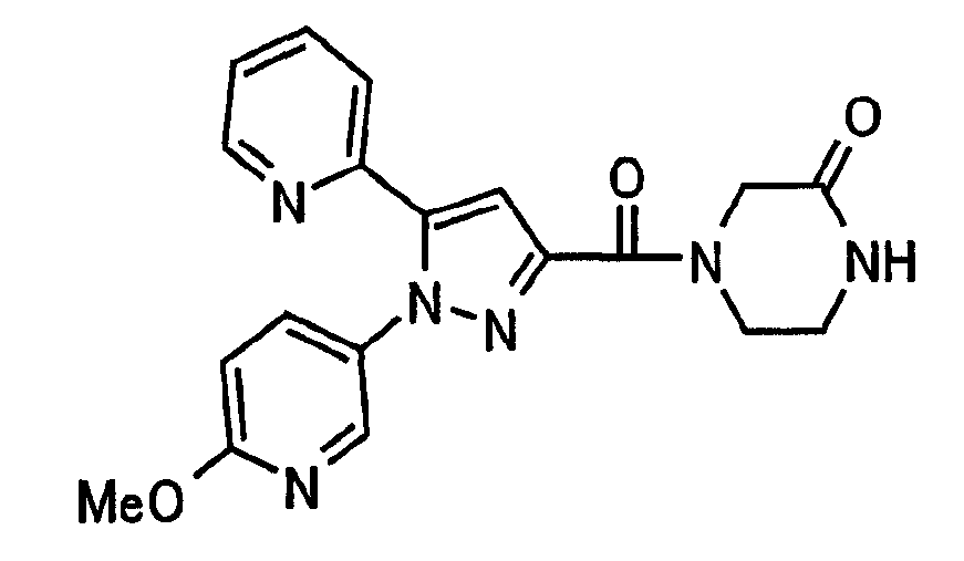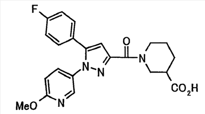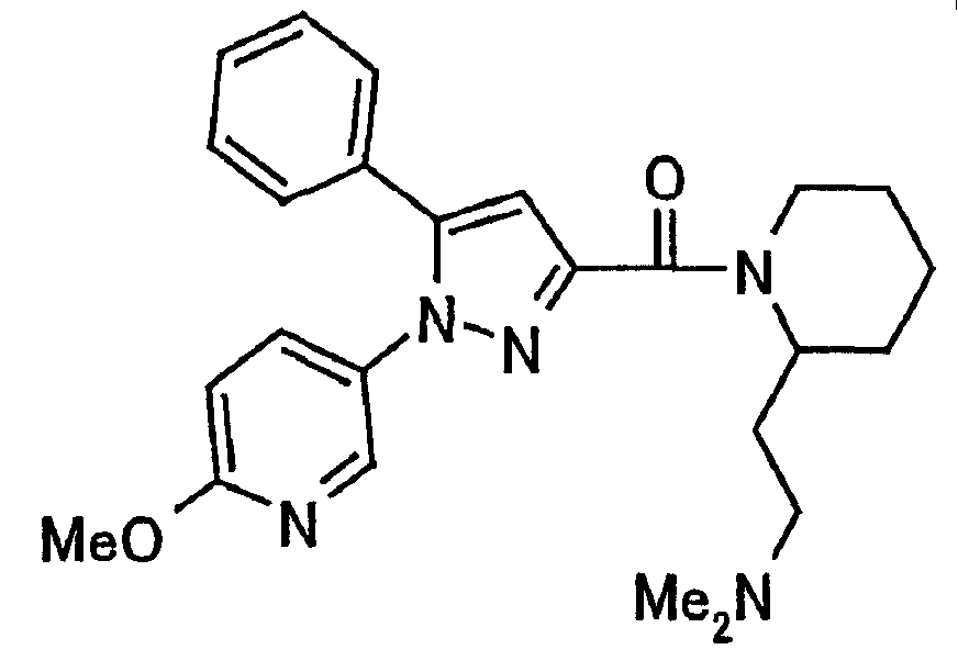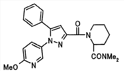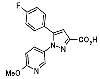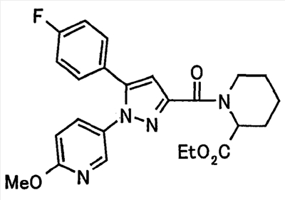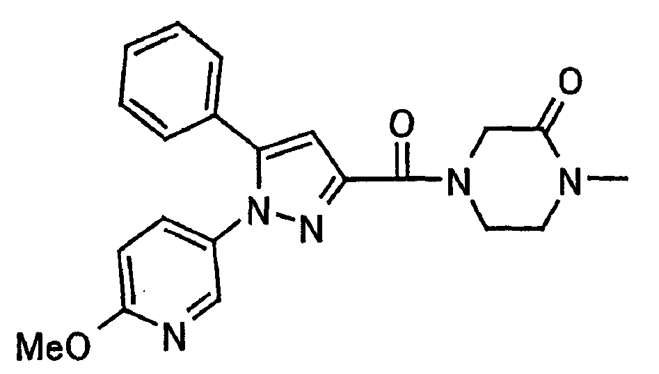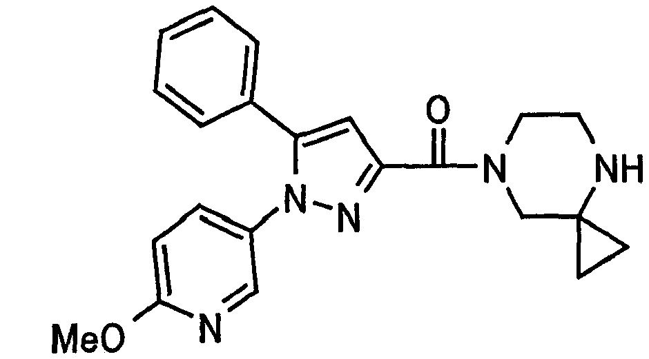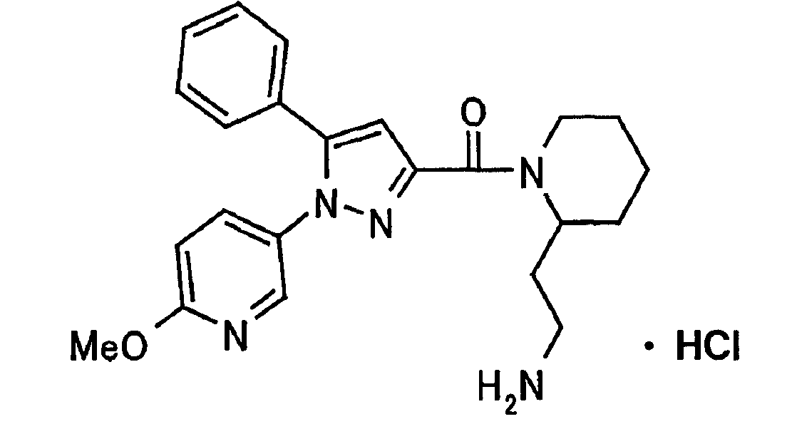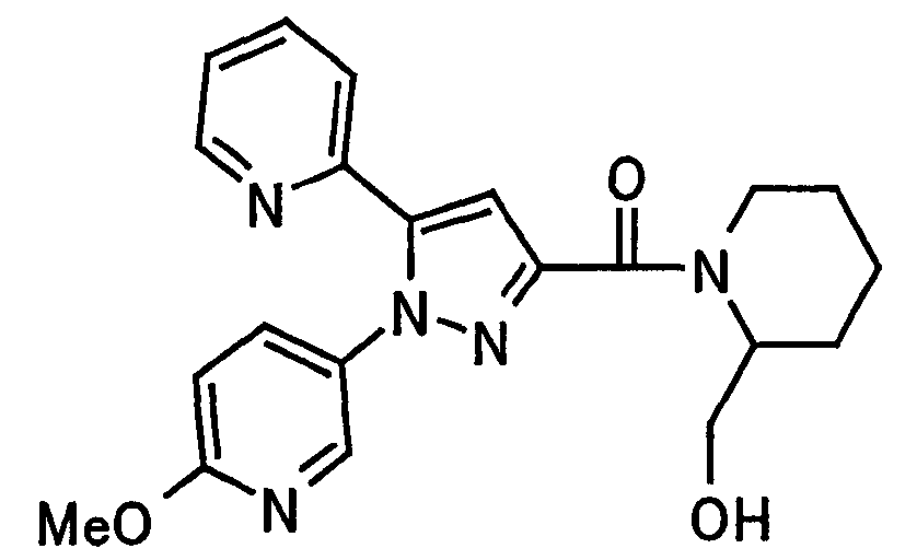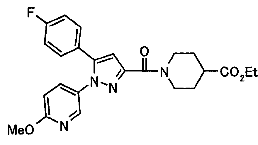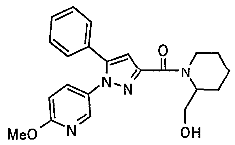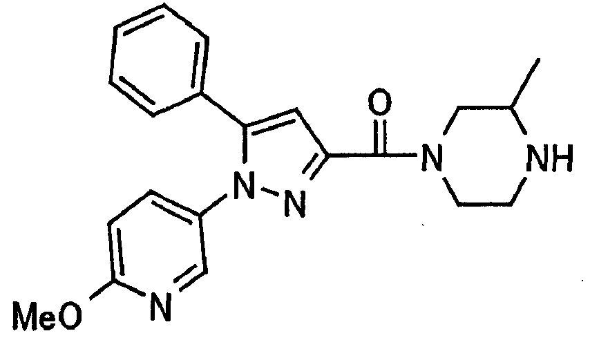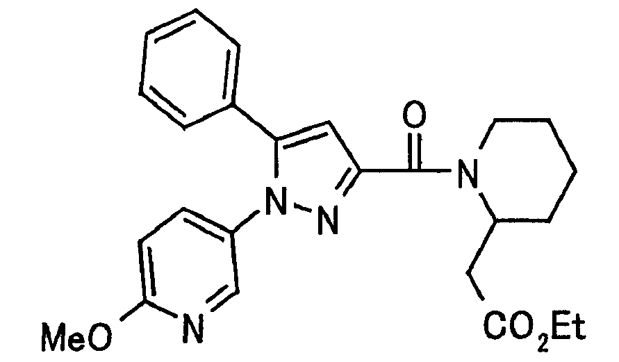 N-Бензилоксипиперидин-2-карбоновую кислоту (2,0 г), 1-гидроксибензотриазол (1,6 г) и гидрохлорид 1-(3-диметиламинопропил)-3-этилкарбодиимида (2,3 г) растворяют в метиленхлориде (20 мл). К образовавшемуся раствору при комнатной температуре добавляют концентрированный водный аммиак (3 мл) и триэтиламин (2 мл) с последующим перемешиванием в течение 3 дней. Реакционную смесь распределяют между водой и метиленхлоридом. Органический слой сушат над безводным сульфатом магния с последующим фильтрованием. Растворитель выпаривают при пониженном давлении. К остатку в метаноле (30 мл) добавляют 10% палладий на угле (1 г, 50% влаги) и образовавшуюся смесь перемешивают в атмосфере водорода в течение 20 часов. Катализатор удаляют фильтрованием. Растворитель выпаривают при пониженном давлении и полученный таким образом масляный продукт сушат, получая при этом указанное в заголовке соединение в виде твердого вещества (970 мг, количественный выход). МС (ESI) m/z: 128 (М+). [Ссылочный пример 132] Метиламид пиперидин-2-карбоновой кислоты Общую процедуру ссылочного примера 131 повторяют с применением N-бензилоксипиперидин-2-карбоновой кислоты (2,0 г) и 1,0 М метиламина в тетрагидрофуране (4 мл), получая при этом указанное в заголовке соединение в виде маслянистого продукта (970 мг, количественный выход). МС (ESI) m/z: 142 (М+). [Ссылочный пример 133] Диметиламид пиперидин-2-карбоновой кислоты Общую процедуру ссылочного примера 131 повторяют с применением N-бензилоксипиперидин-2-карбоновой кислоты (6,4 г) и гидрохлорида диметиламина (2 г), получая при этом указанное в заголовке соединение в виде маслянистого продукта (3,8 г, количественный выход). МС (ESI) m/z: 156 (М+). [Ссылочный пример 134] Этиловый эфир 4-(4-фторфенил)-2,4-диоксобутановой кислоты Общую процедуру ссылочного примера 3-1) повторяют с применением 4′-фторацетофенона (3,0 г) и диэтилоксалата (5,9 мл), получая при этом указанное в заголовке соединение в виде твердого вещества (3,12 г, 60%). 1H-ЯМР (400 МГц, CDCl3) МС (ESI) m/z: 239 (М+1)+. [Ссылочный пример 135] Этиловый эфир 5-(4-фторфенил)-1-(6-метокси-3-пиридил)пиразол-3-карбоновой кислоты Общую процедуру ссылочного примера 3-2) повторяют с применением 5-гидразино-2-метоксипиридина (1,0 г), полученного в ссылочном примере 2, и этилового эфира 4-(4-фторфенил)-2,4-диоксобутановой кислоты (1,88 г), полученного в ссылочном примере 134, получая при этом указанное в заголовке соединение в виде маслянистого продукта (2,12 г, 86%). 1H-ЯМР (400 МГц, CDCl3) МС (EI) m/z: 341 (М+). [Ссылочный пример 136] 5-(4-Фторфенил)-1-(6-метокси-3-пиидил)пиразол-3-карбоновая кислота Водный 1 н. гидроксид натрия (1,2 л) добавляют к этиловому эфиру 5-(4-фторфенил)-1-(6-метокси-3-пиридил)пиразол-3-карбоновой кислоты (164 г) в метаноле (1,6 л) и образовавшуюся смесь перемешивают при комнатной температуре в течение 5 часов. Растворитель реакции удаляют при пониженном давлении и остаток распределяют между водой и диэтиловым эфиром. рН водного слоя регулируют при значении 2 посредством добавления водной 1 н. хлористоводородной кислоты (1,5 л) и осажденные кристаллы растворяют в хлороформе. Образовавшийся раствор распределяют с применением насыщенного раствора соли и органический слой сушат над безводным сульфатом натрия с последующим фильтрованием. Растворитель выпаривают при пониженном давлении и осажденные кристаллы из диэтилового эфира выделяют фильтрованием, получая при этом указанное в заголовке соеди