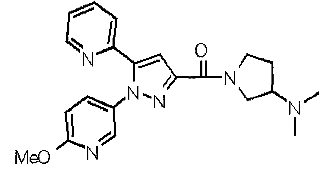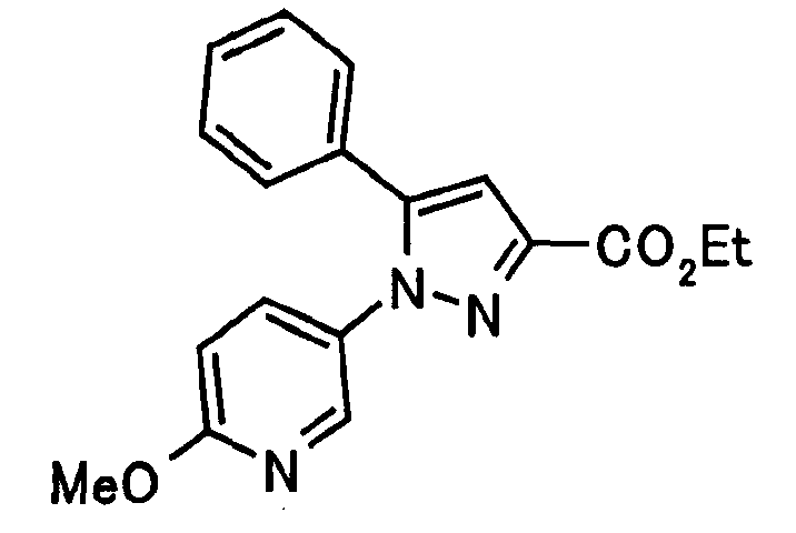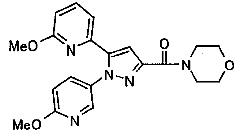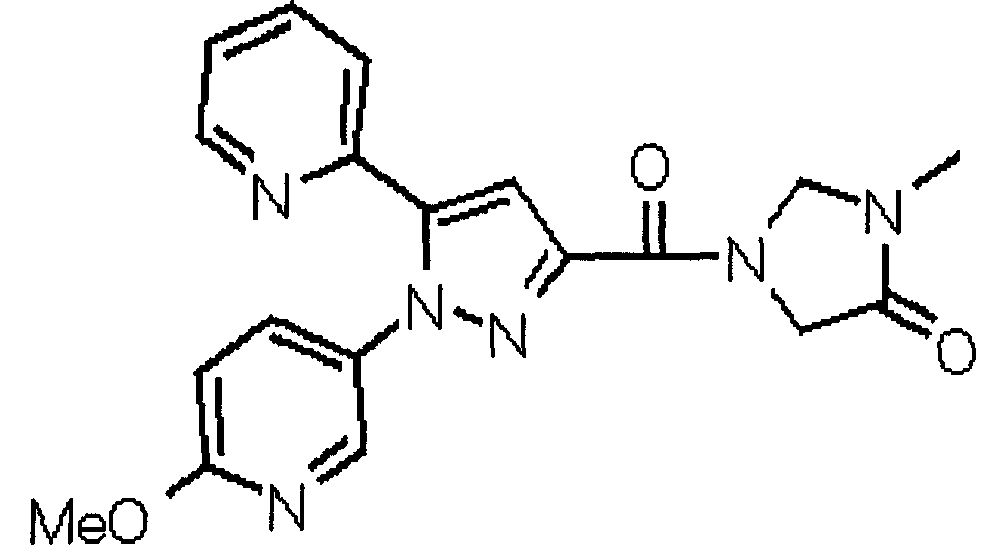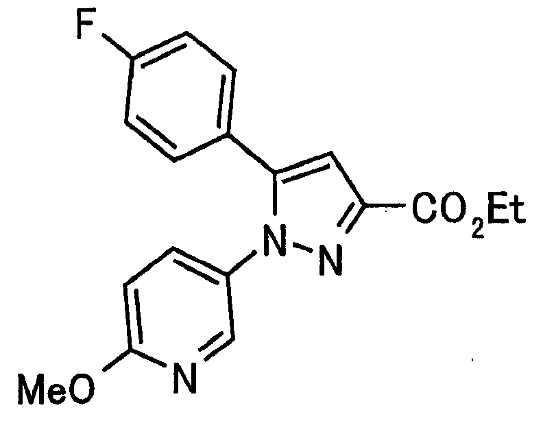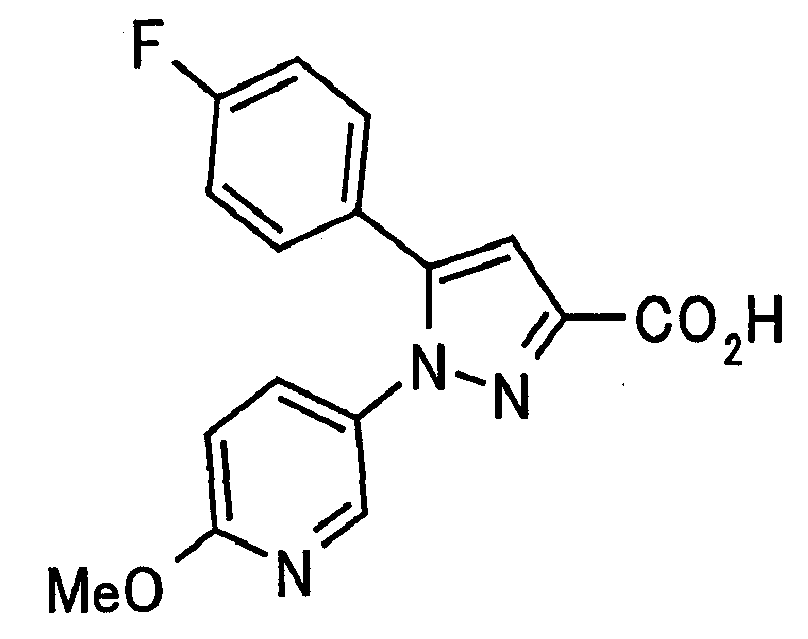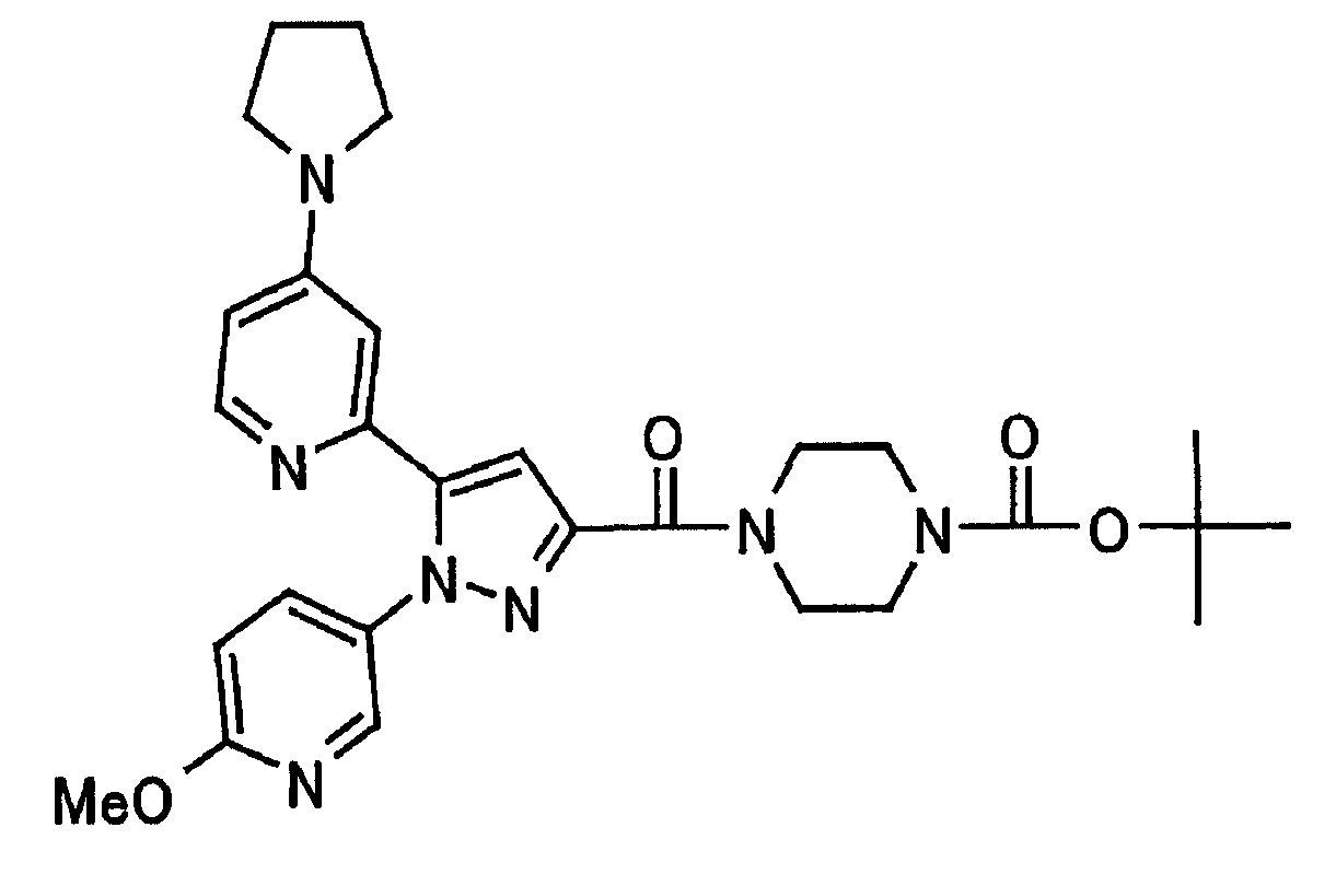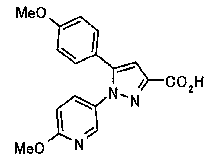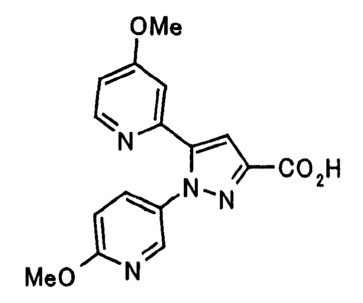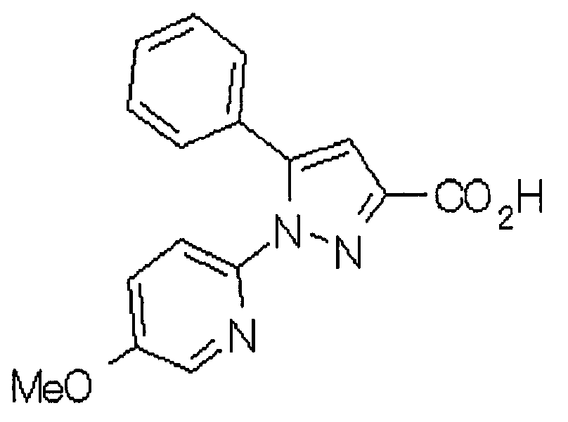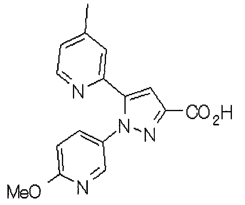 В атмосфере аргона 0,93 М метилмагнийбромид в тетрагидрофуране (13,8 мл) добавляют по каплям к 4-метоксипиридин-2-карбонитрилу (1,56 г) в тетрагидрофуране (31 мл) при -78°С с последующим перемешиванием в течение 15 минут. После этого реакционную смесь перемешивают при 0°С в течение 15 минут и затем при комнатной температуре в течение 5 часов. К реакционной смеси по каплям добавляют воду. Образовавшуюся смесь распределяют между водой и этилацетатом. Органический слой сушат над безводным сульфатом натрия с последующим фильтрованием. Растворитель выпаривают при пониженном давлении и остаток очищают колоночной хроматографией на силикагеле (гексан-этилацетат), получая при этом указанное в заголовке соединение в виде твердого вещества (1,30 г, 73%). 1H-ЯМР (400 МГц, CDCl3) МС (ESI) m/z: 152 (М+H)+. [Ссылочный пример 17] Этиловый эфир 4-(4-метокси-2-пиридил)-2,4-диоксобутановой кислоты Способом, аналогичным способу, описанному в стадии 1) ссылочного примера 3, указанное в заголовке соединение получают в виде твердого вещества (0,713 г, 33%) с применением 1-(4-метокси-2-пиридил)этанона (1,28 г) и диэтилоксалата (2,30 мл). 1H-ЯМР (400 МГц, CDCl3) МС (EI) m/z: 251 (М+). [Ссылочный пример 18] Этиловый эфир 1-(6-метокси-3-пиридил)-5-(4-метокси-2-пиридил)пиразол-3-карбоновой кислоты Способом, аналогичным способу, описанному в стадии 2) ссылочного примера 3, указанное в заголовке соединение получают в виде твердого вещества (0,473 г, 49%) с применением этилового эфира 4-(4-метокси-2-пиридил)-2,4-диоксобутановой кислоты (0,691 г), полученного в ссылочном примере 17, и 5-гидразино-2-метоксипиридина (0,383 г), полученного в ссылочном примере 2. 1H-ЯМР (400 МГц, CDCl3) МС (FAB) m/z: 355 (М+H)+. [Ссылочный пример 19] 1-(6-метокси-3-пиридил)-5-(4-метокси-2-пиридил)пиразол-3-карбоновая кислота 1 н. Водный раствор гидроксида натрия (2,23 мл) добавляют к этиловому эфиру 1-(6-метокси-3-пиридил)-5-(4-метокси-2-пиридил)пиразол-3-карбоновой кислоты (0,416 г), полученному в ссылочном примере 18, в смеси метанола (6,3 мл) и тетрагидрофурана (6,3 мл) при комнатной температуре с последующим перемешиванием в течение 5 часов. Реакционную смесь нейтрализуют 1 н. водным раствором хлористоводородной кислоты (2,23 мл) и затем распределяют между водой и хлороформом. Затем водный слой экстрагируют хлороформом два раза. Органический слой сушат над безводным сульфатом натрия с последующим фильтрованием. Растворитель выпаривают при пониженном давлении, получая при этом указанное в заголовке соединение в виде твердого вещества (0,353 г, 92%). 1Н-ЯМР (400 МГц, ДМСО-d6) МС (FAB) m/z: 327 (М+H)+. [Ссылочный пример 20] 2-Бром-6-метоксипиридин В атмосфере аргона метоксид натрия (1,82 г) добавляют к 2,6-дибромпиридину (8,0 г) в толуоле (120 мл) с последующим перемешиванием при 120°С в течение 13 часов. Затем к смеси добавляют метоксид натрия (0,728 г) с последующим перемешиванием при 120°С в течение 6 часов. Смесь охлаждают на воздухе. Реакционную смесь распределяют между водой и этилацетатом. Органический слой сушат над безводным сульфатом натрия с последующим фильтрованием. Растворитель выпаривают при пониженном давлении. Остаток очищают колоночной хроматографией на силикагеле (гексан-этилацетат), получая при этом указанное в заголовке соединение в виде маслянистого вещества (5,64 г, 89%). 1H-ЯМР (400 МГц, CDCl3) [Ссылочный пример 21] 6-Метоксипиридин-2-карбонитрил Цианид меди (I) (2,68 г) добавляют к 2-бром-6-метоксипиридину (5,62 г) в N,N-диметилформамиде (112 мл) при к