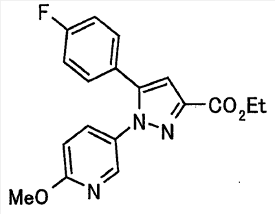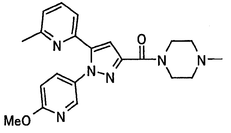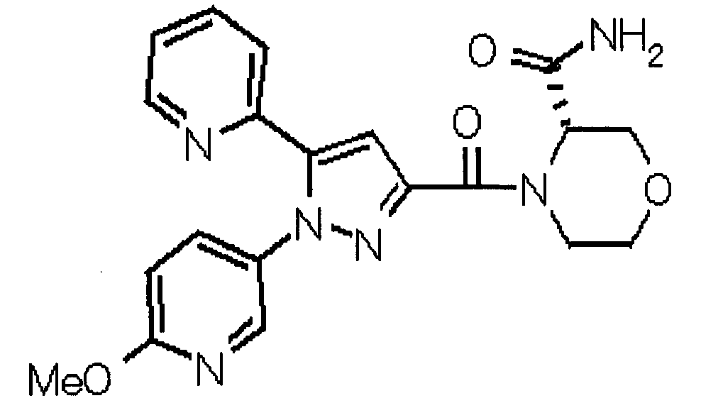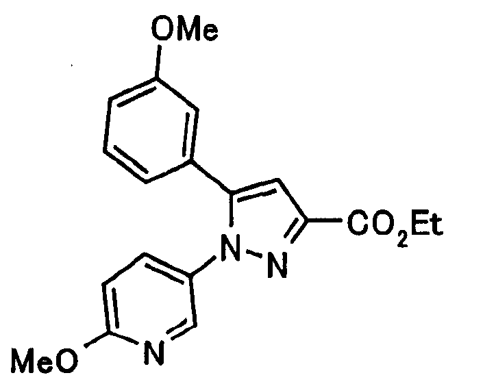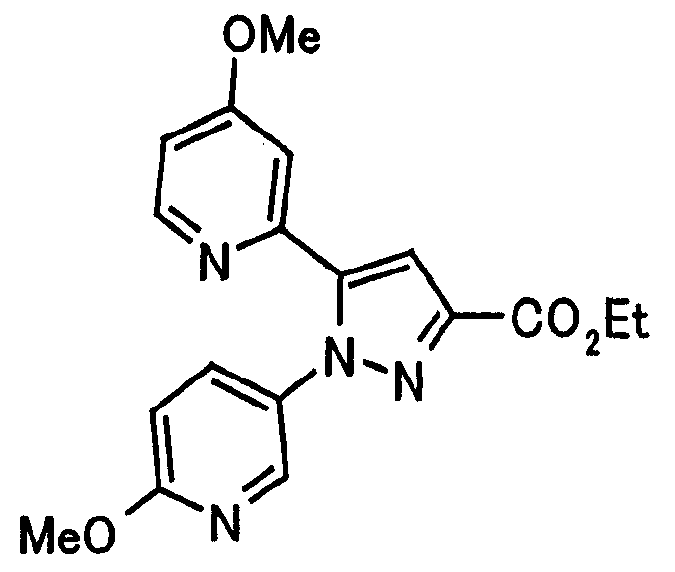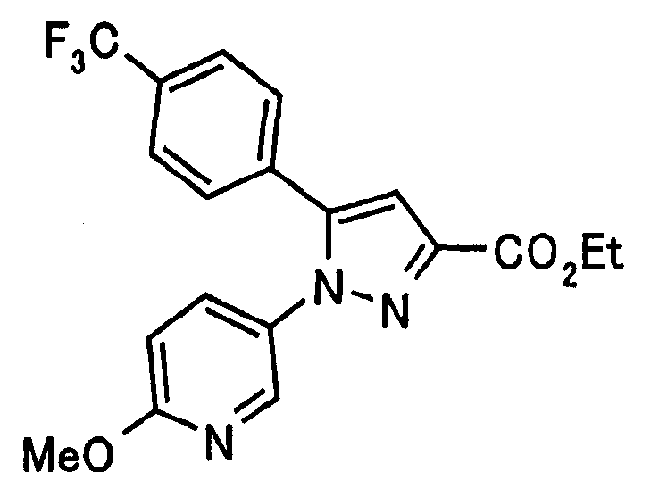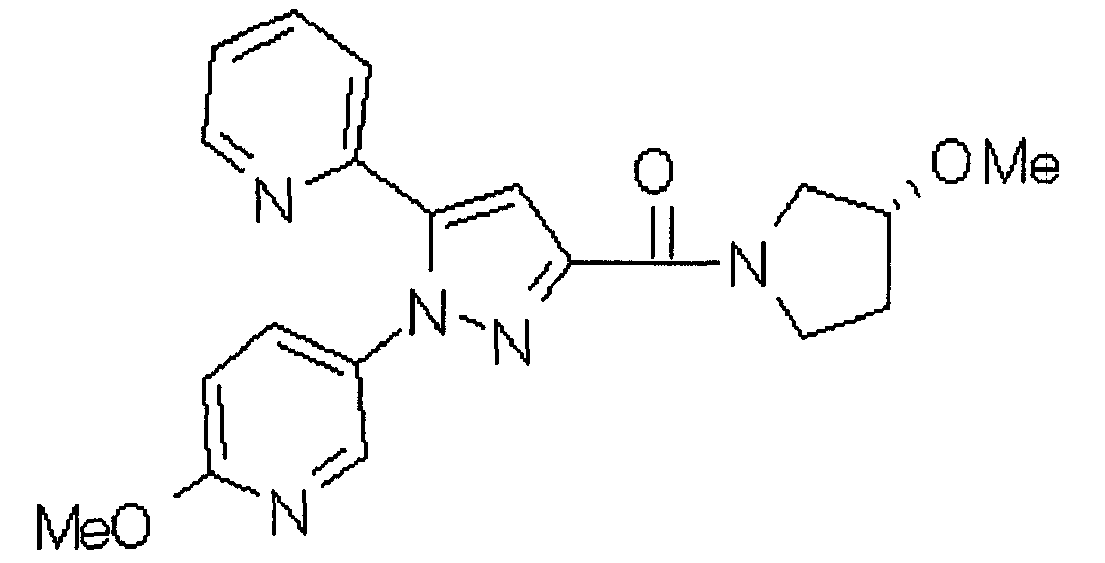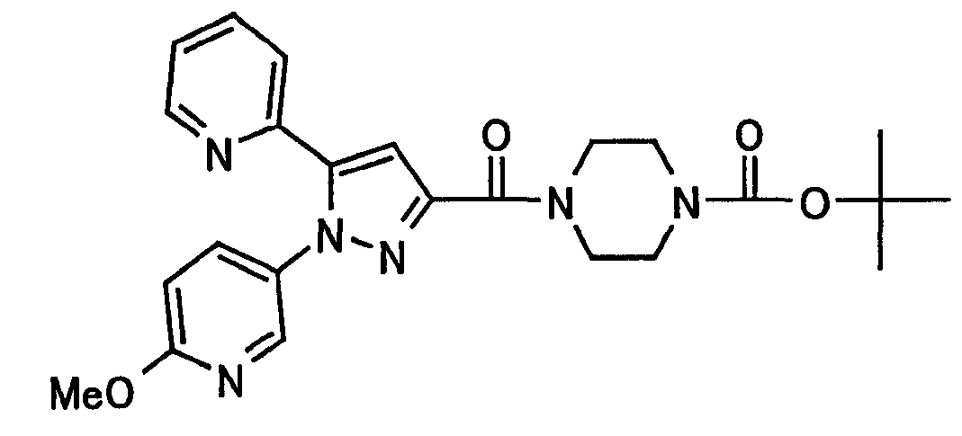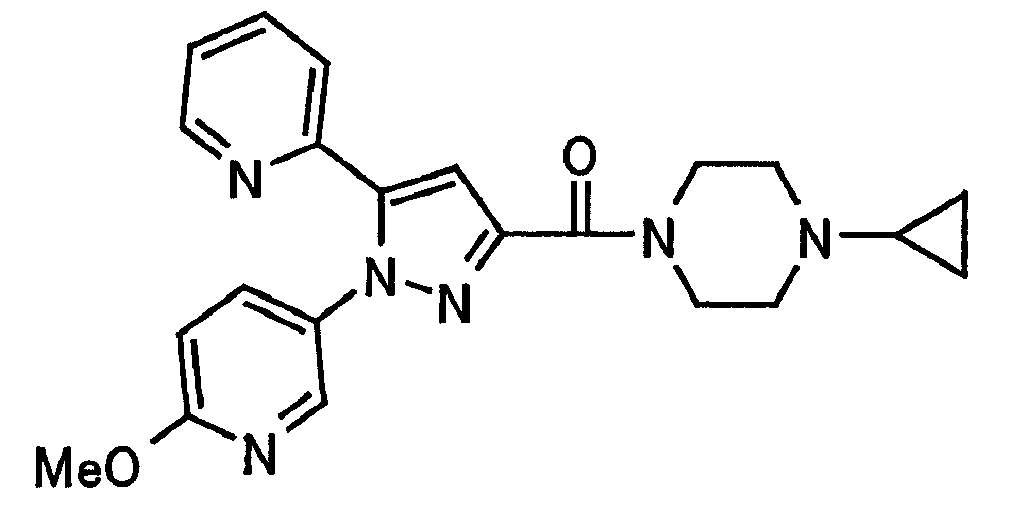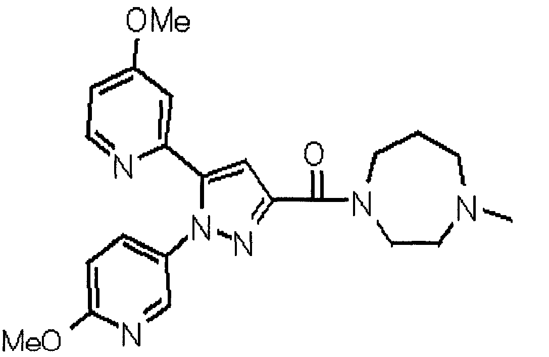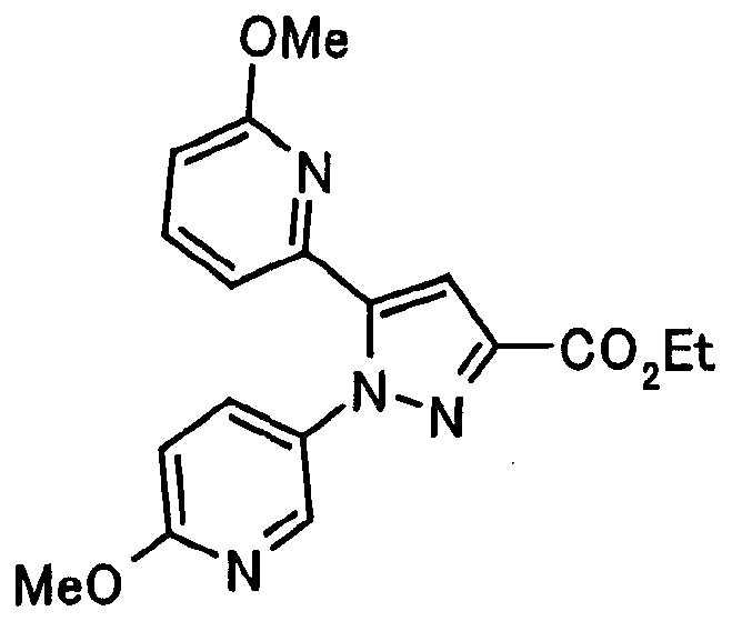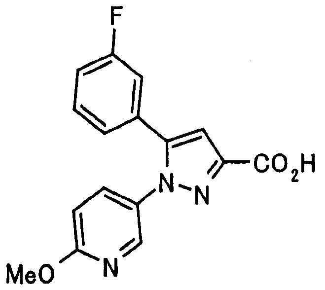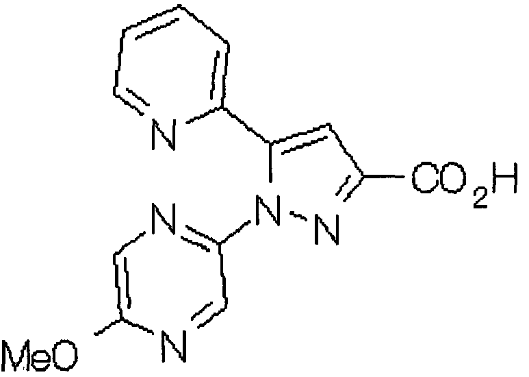 В атмосфере аргона 0,93 М метилмагнийбромид в тетрагидрофуране (13,8 мл) добавляют по каплям к 4-метоксипиридин-2-карбонитрилу (1,56 г) в тетрагидрофуране (31 мл) при -78°С с последующим перемешиванием в течение 15 минут. После этого реакционную смесь перемешивают при 0°С в течение 15 минут и затем при комнатной температуре в течение 5 часов. К реакционной смеси по каплям добавляют воду. Образовавшуюся смесь распределяют между водой и этилацетатом. Органический слой сушат над безводным сульфатом натрия с последующим фильтрованием. Растворитель выпаривают при пониженном давлении и остаток очищают колоночной хроматографией на силикагеле (гексан-этилацетат), получая при этом указанное в заголовке соединение в виде твердого вещества (1,30 г, 73%). 1H-ЯМР (400 МГц, CDCl3) МС (ESI) m/z: 152 (М+H)+. [Ссылочный пример 17] Этиловый эфир 4-(4-метокси-2-пиридил)-2,4-диоксобутановой кислоты Способом, аналогичным способу, описанному в стадии 1) ссылочного примера 3, указанное в заголовке соединение получают в виде твердого вещества (0,713 г, 33%) с применением 1-(4-метокси-2-пиридил)этанона (1,28 г) и диэтилоксалата (2,30 мл). 1H-ЯМР (400 МГц, CDCl3) МС (EI) m/z: 251 (М+). [Ссылочный пример 18] Этиловый эфир 1-(6-метокси-3-пиридил)-5-(4-метокси-2-пиридил)пиразол-3-карбоновой кислоты Способом, аналогичным способу, описанному в стадии 2) ссылочного примера 3, указанное в заголовке соединение получают в виде твердого вещества (0,473 г, 49%) с применением этилового эфира 4-(4-метокси-2-пиридил)-2,4-диоксобутановой кислоты (0,691 г), полученного в ссылочном примере 17, и 5-гидразино-2-метоксипиридина (0,383 г), полученного в ссылочном примере 2. 1H-ЯМР (400 МГц, CDCl3) МС (FAB) m/z: 355 (М+H)+. [Ссылочный пример 19] 1-(6-метокси-3-пиридил)-5-(4-метокси-2-пиридил)пиразол-3-карбоновая кислота 1 н. Водный раствор гидроксида натрия (2,23 мл) добавляют к этиловому эфиру 1-(6-метокси-3-пиридил)-5-(4-метокси-2-пиридил)пиразол-3-карбоновой кислоты (0,416 г), полученному в ссылочном примере 18, в смеси метанола (6,3 мл) и тетрагидрофурана (6,3 мл) при комнатной температуре с последующим перемешиванием в течение 5 часов. Реакционную смесь нейтрализуют 1 н. водным раствором хлористоводородной кислоты (2,23 мл) и затем распределяют между водой и хлороформом. Затем водный слой экстрагируют хлороформом два раза. Органический слой сушат над безводным сульфатом натрия с последующим фильтрованием. Растворитель выпаривают при пониженном давлении, получая при этом указанное в заголовке соединение в виде твердого вещества (0,353 г, 92%). 1Н-ЯМР (400 МГц, ДМСО-d6) МС (FAB) m/z: 327 (М+H)+. [Ссылочный пример 20] 2-Бром-6-метоксипиридин В атмосфере аргона метоксид натрия (1,82 г) добавляют к 2,6-дибромпиридину (8,0 г) в толуоле (120 мл) с последующим перемешиванием при 120°С в течение 13 часов. Затем к смеси добавляют метоксид натрия (0,728 г) с последующим перемешиванием при 120°С в течение 6 часов. Смесь охлаждают на воздухе. Реакционную смесь распределяют между водой и этилацетатом. Органический слой сушат над безводным сульфатом натрия с последующим фильтрованием. Растворитель выпаривают при пониженном давлении. Остаток очищают колоночной хроматографией на силикагеле (гексан-этилацетат), получая при этом указанное в заголовке соединение в виде маслянистого вещества (5,64 г, 89%). 1H-ЯМР (400 МГц, CDCl3) [Ссылочный пример 21] 6-Метоксипиридин-2-карбонитрил Цианид меди (I) (2,68 г) добавляют к 2-бром-6-метоксипиридину (5,62 г) в N,N-диметилформамиде (112 мл) при к